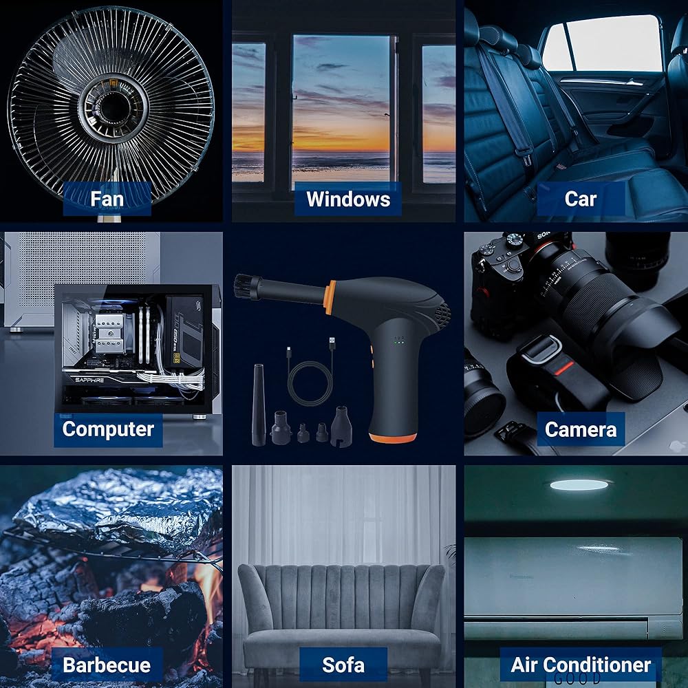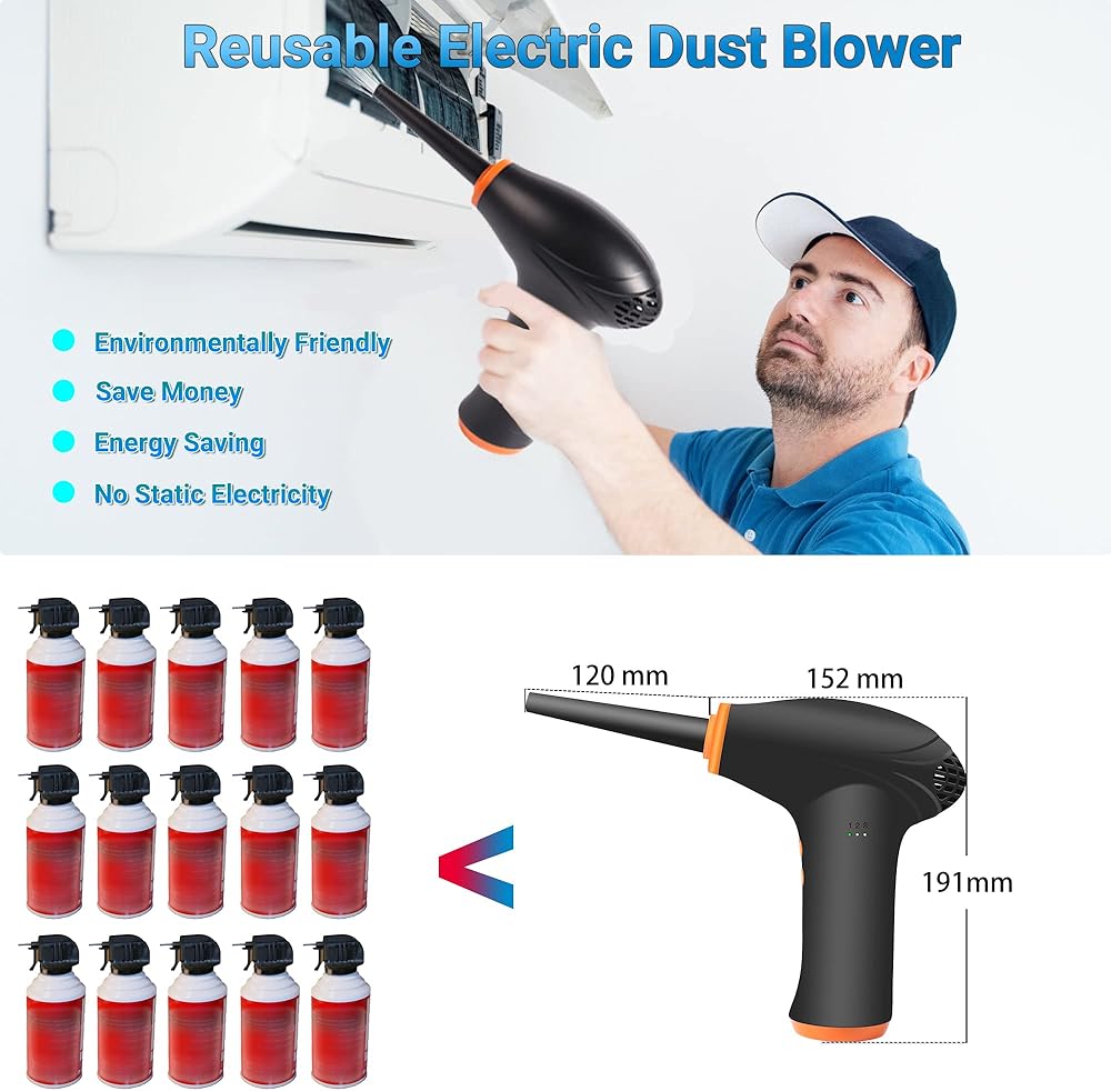 【Eco-Friendly & Save Money】The Electric Air Duster Compressed can be reused, It equals over 5000 traditional canned air, helping you save money rather than constantly buying canned air.Compared with the compressed air can, the dust blower will not produce chemicals, liquids or freezing during cleaning. It protects your electronics from liquids.