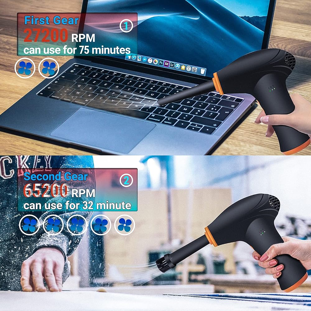 【High Power】Our compressed air duster for computer has a maximum speed of 65,000RPM, which can blow air at a speed of 95m/s instantly, providing high pressure air continuously.It works with high efficiency and the dust removal effect is remarkable, you can clean different places with various auxiliary nozzles.