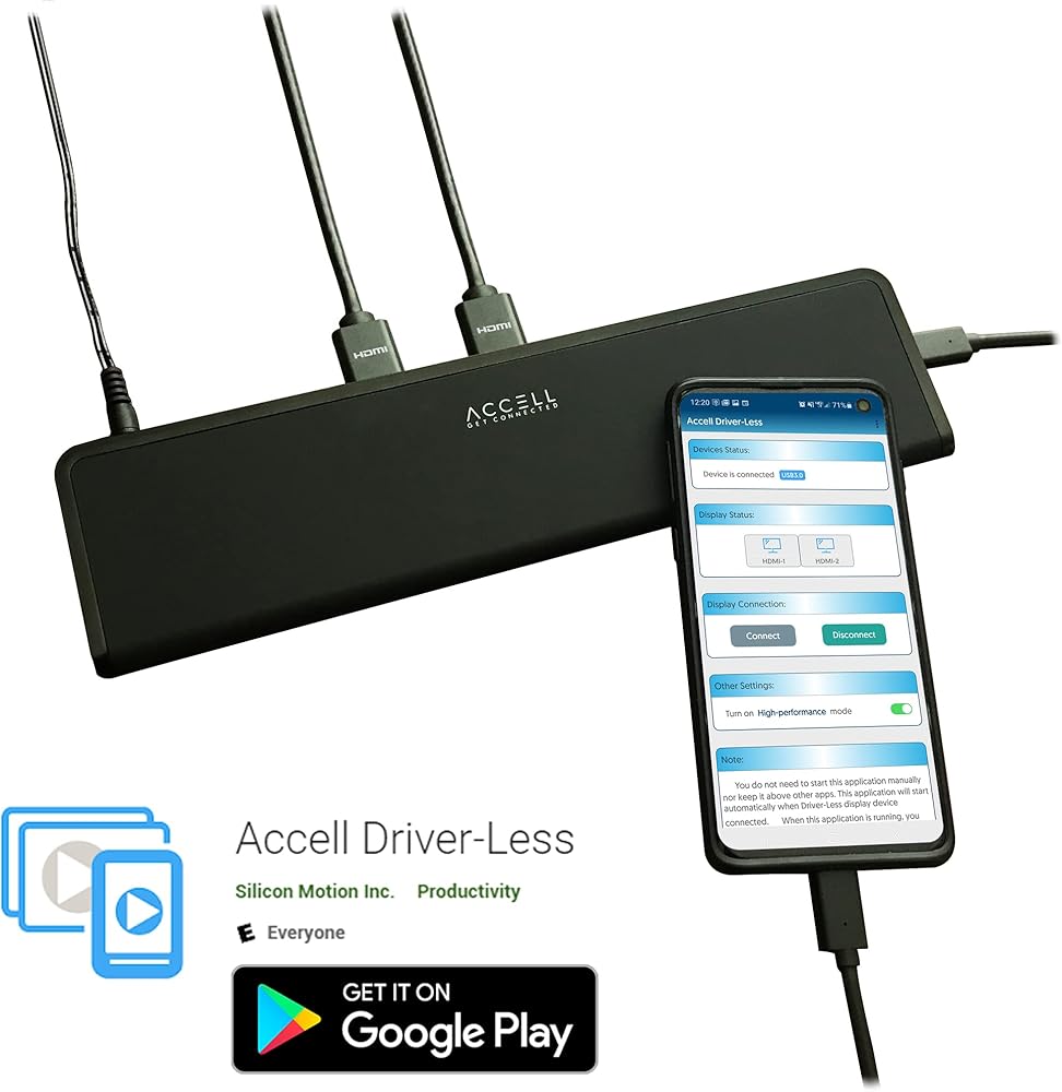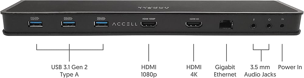 Accell InstantView USB-C 4K Docking Station - 2 HDMI, 3 USB 3.1 Gen 2 10 Gbps, Gigabit Ethernet and Audio Ports Compatible with Microsoft Windows, MacBooks, Chromebooks, and Android.