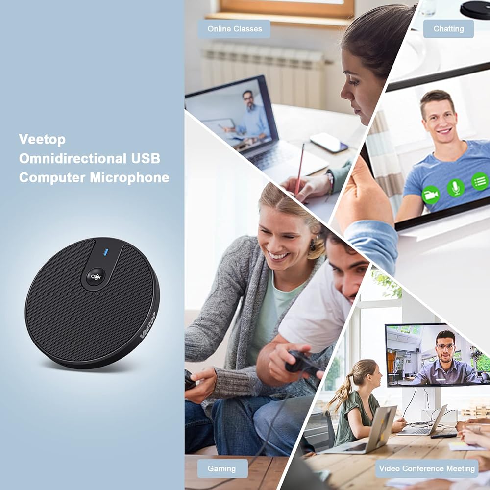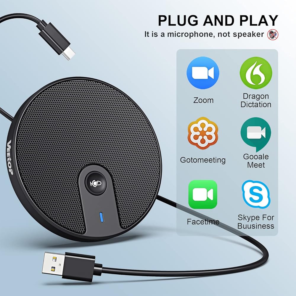 Veetop USB Conference Microphone for Computer Desktop Laptop 360° Omnidirectional Portable Condenser PC Mic with Mute Plug & Play 3.5mm Aux Jack for Video Conference Zoom Meeting Skype Call Recording