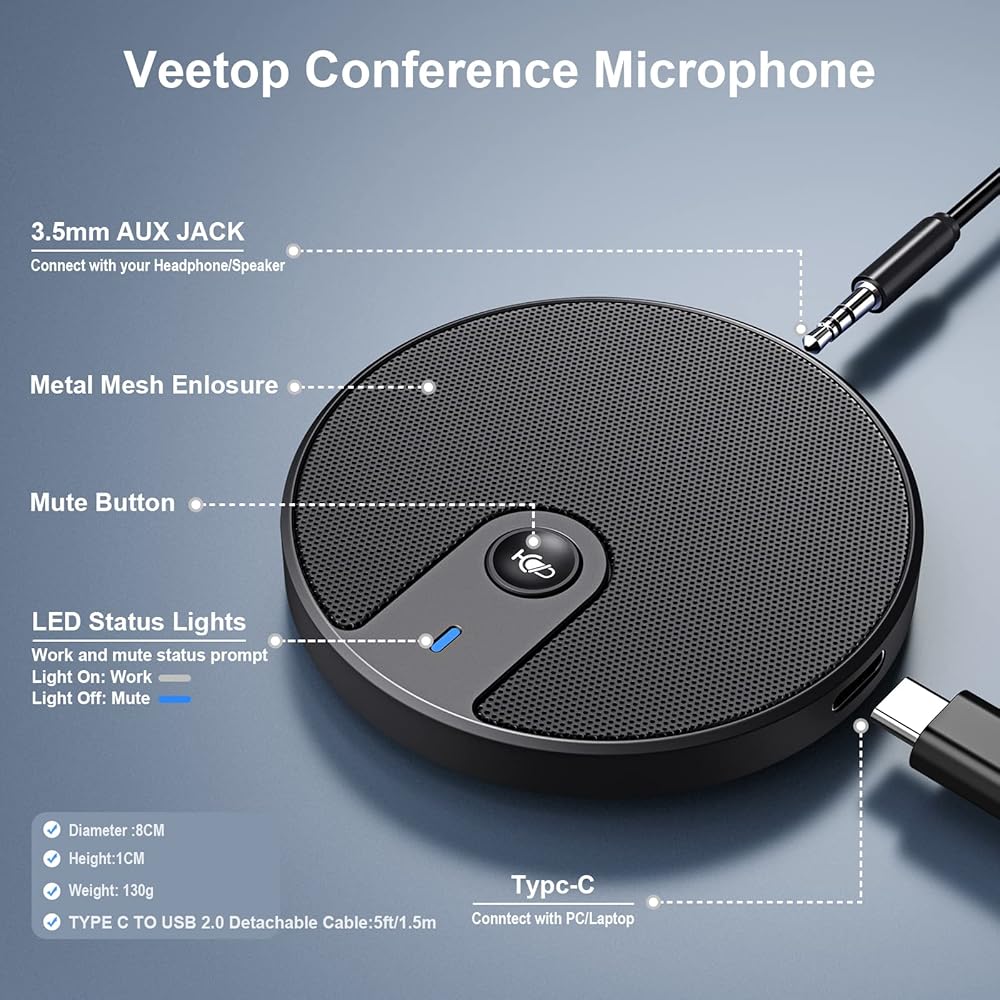 【With a 3.5mm Aux Jack & Detectable Cable】Veetop conference microphone with a 3.5mm audio jack, which can be connected to external audio equipment such as earphones/headphones and speakers. Comparing with others, we attach Type c to usb 2.0 Detectable Cable which is more easily store. Portable, Small& compact design that doesn't take up space in your laptop bag or pocket.
