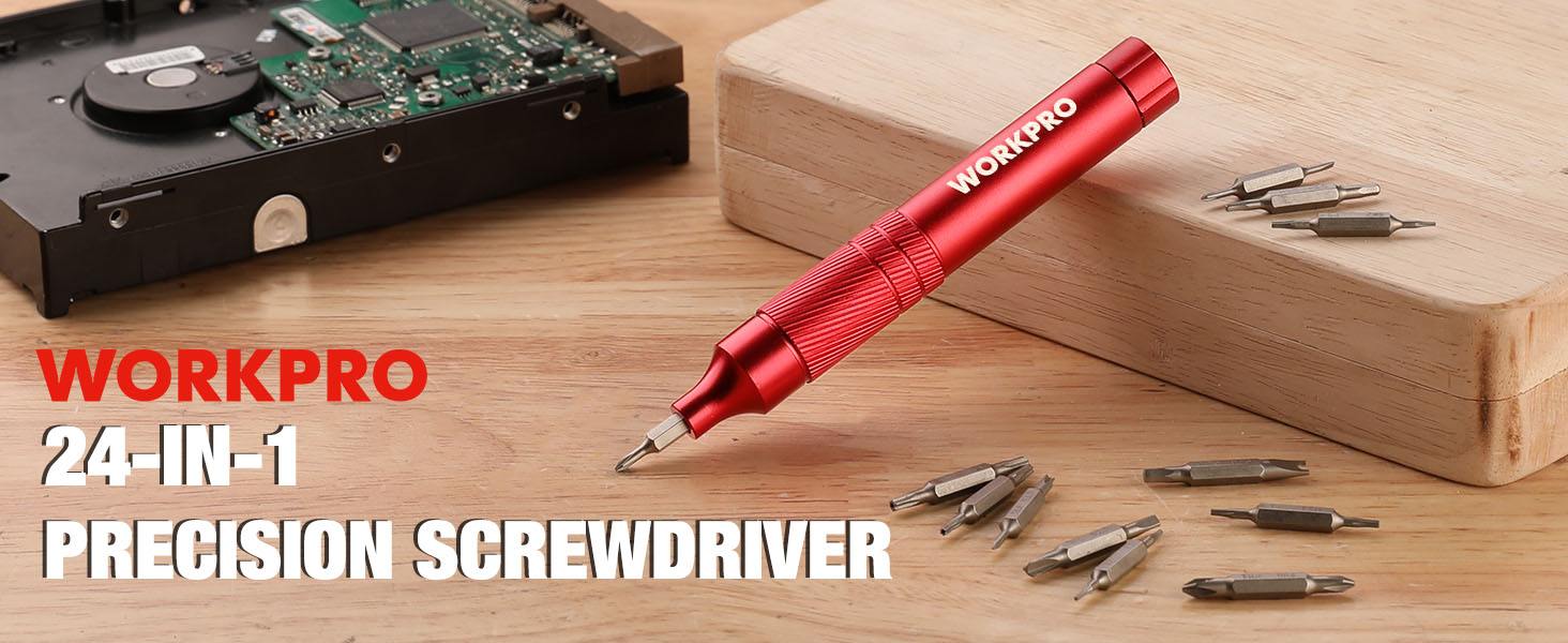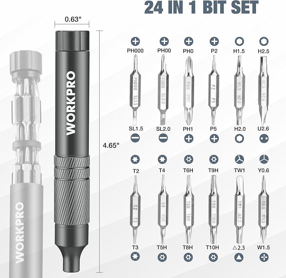 24 in 1 Mini Screwdriver Set: WORKPRO precision screwdriver set comes with a wide assortment of the most commonly used bits to accommodate a variety of applications, including Phillips (PH000, PH00, PH0, PH1), Slotted (L1.5, SL2.0), Torx (T2, T3, T4), Torx Security (T5H, T6H, T8H, T9H, T10H), Hex (H1.5, H2.0, H2.5), Y-shaped (Y0.6), W-shaped (W1.5), U-shaped (U2.6), Tri-Wing (TW1), Tri-Angle (▲2.3), Pentalobe (P2, P5).