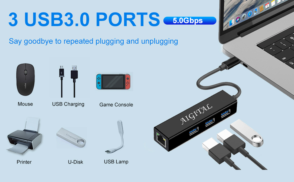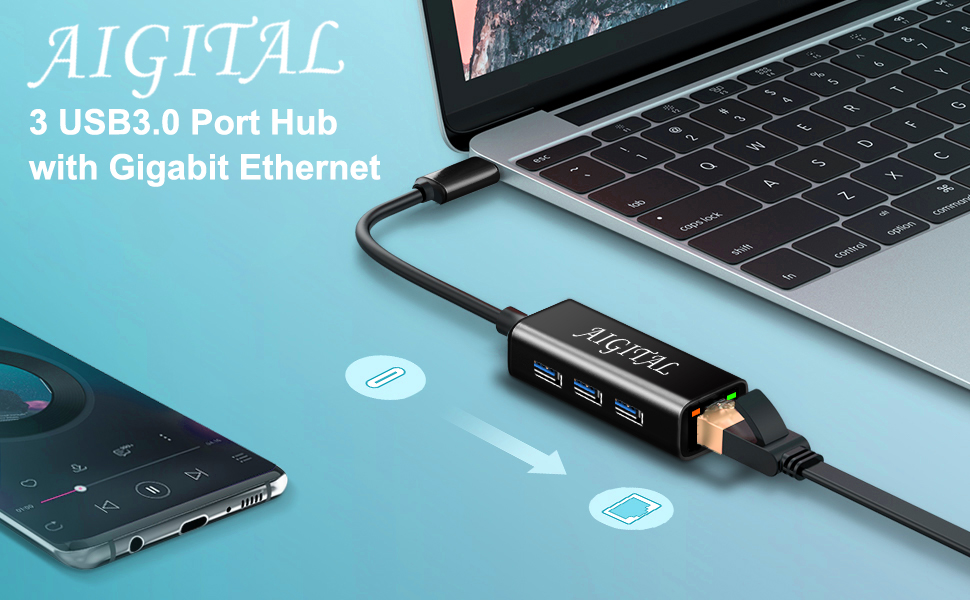 USB C Hub, Aigital USB C to USB Adapter with 3 USB3.0 Ports, 10/100/1000Mbps USB to Ethernet Adapter, Portable USB C Hub Multiport Adapter for MacBook Pro Air Chromebook and Type C Devices