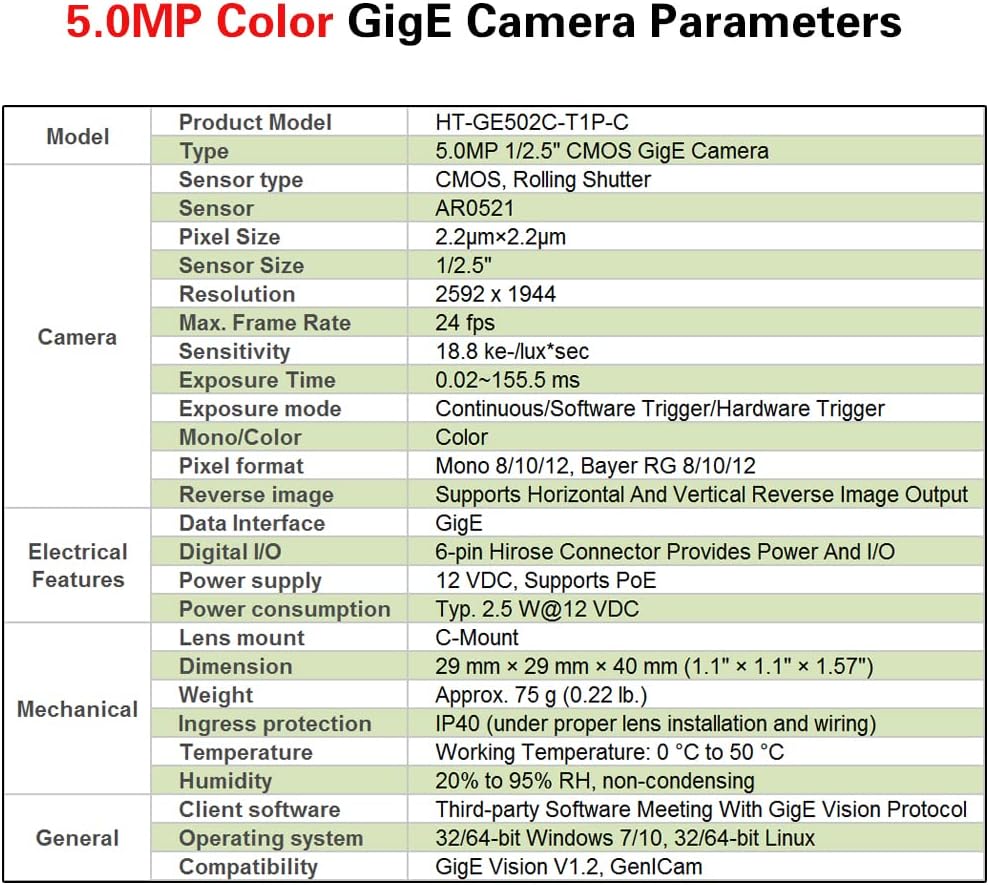 GigE Ethernet 5.0MP 1/2.5" Color Industrial Camera Machine Vision Rolling Shutter C-Mouth Area Scan Camera Sensor 2592X1944 24FPS