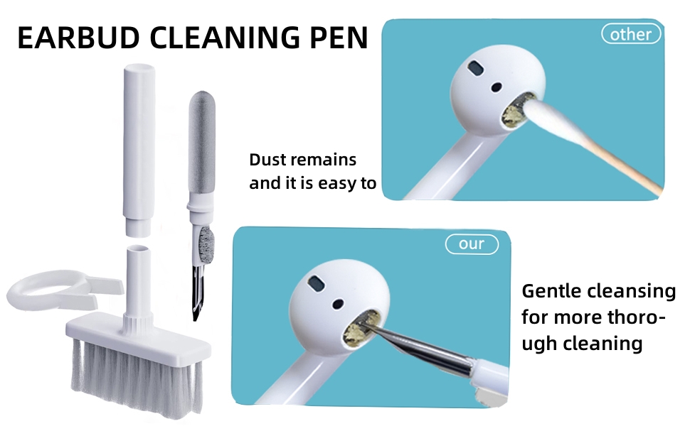 Easy to use: Use the pen tip to clean the dust and debris in the Bluetooth headset box or the gap of the headset, and then use the high-density brush on the side to wipe away the debris