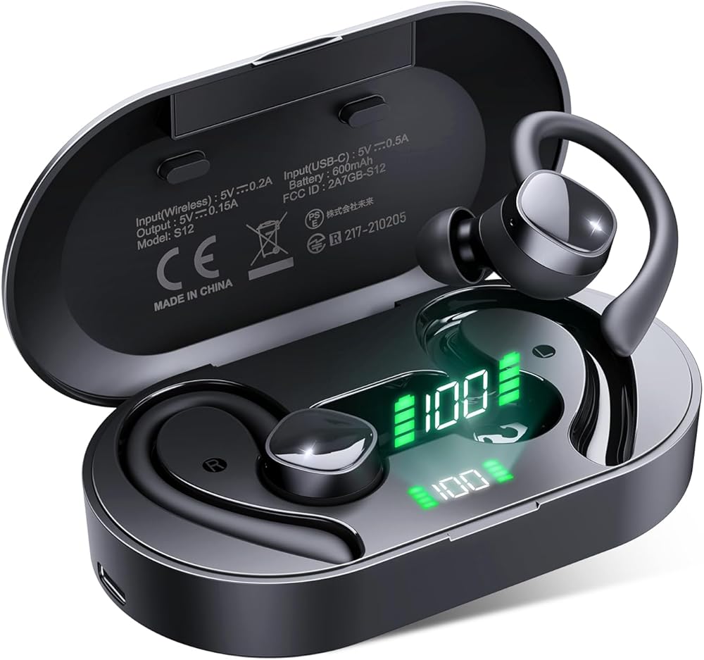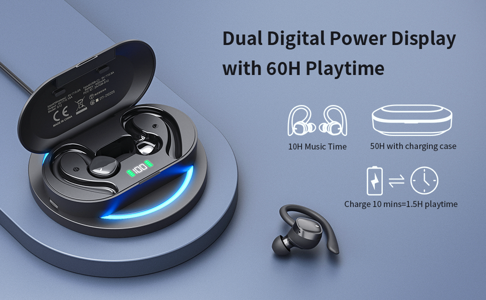 60 Hours Playtime & Dual LED Digital Display:The charging case can charge the sports earbuds 5 times and total 60 hours playtime, saying goodbye to the troubles of frequent charging! Features with LED digital display shows remaining in percentage from 1%-100% to make you clearly know the battery any time. Each grid represents 25% power of bluetooth headphones