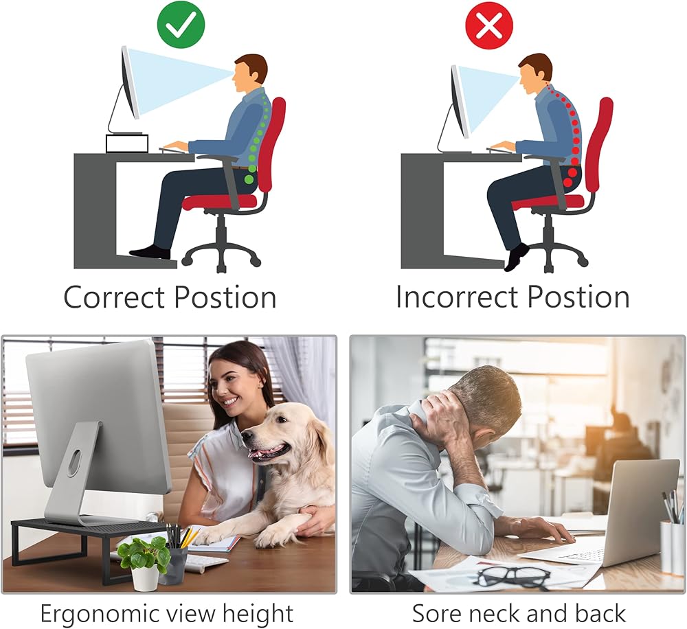 Protect Your Spine** Over 90% computer workers have neck pain problem and our ergonomic Monitor Stand can raise up your monitor 5” high to your eye level height for comfortable reading experience. It can also improve posture to relieve eye strain and prevent back & neck pain.