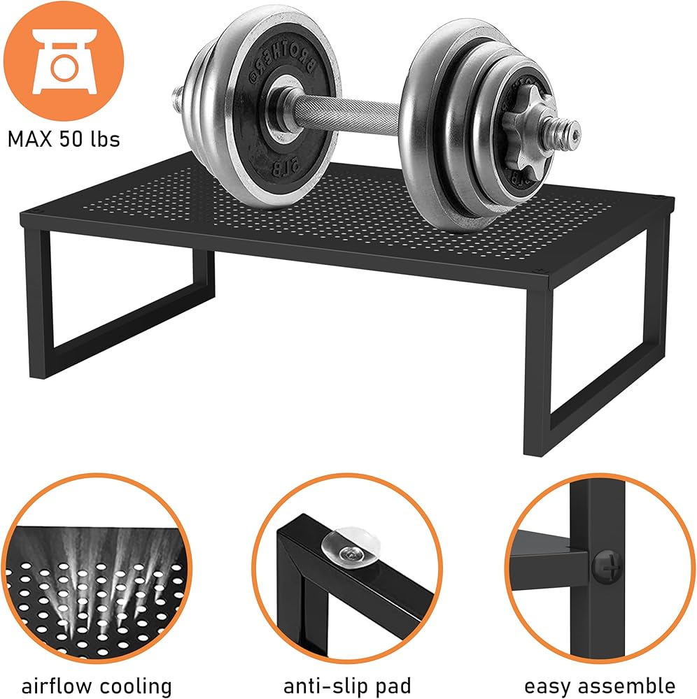 Lift Your Monitor Up** Our metal square tube with heavy duty steel perforated board builds sturdy monitor stand riser with MAX 50 LBS loading and Anti-Slip Suction and Silicone Pad for heavy monitors and printers. The perforated holes improve the air flow going through your device and keep your computer or device cool.