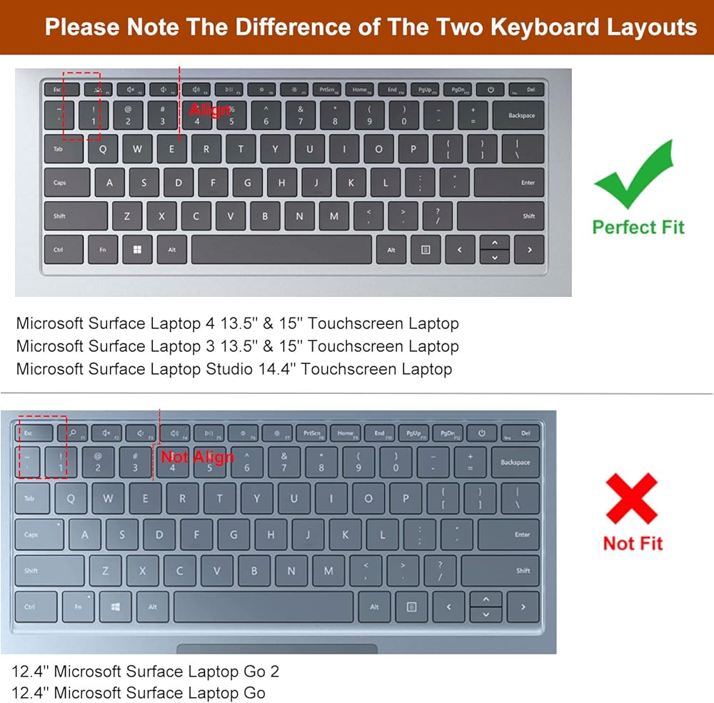 【COMPATIBLE WITH】 Microsoft Surface Laptop 5 13.5" & 15", Surface Laptop 4 13.5 inch & 15 inch Touchscreen laptop, Microsoft Surface Laptop 3 13.5 inch & 15 inch Touchscreen laptop 2019-2021 Release. Microsoft Surface Laptop 3 Keyboard Cover, Please check the photo, confirm it can be used in your keyboard model.