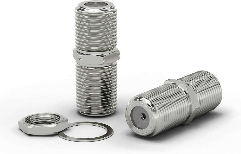 This cable extension adapter connects two coaxial video cables for TV's, DVD's, DVR's, VCR players and more (including compatible modems, antennas and other analog setups). Featuring easy to screw in F-pin connections, this coupler is designed for indoor and outdoor use, seamlessly connecting, joining and extending the length of RG58, RG59, RG6, and RG11 coax cables. By providing a reliable and durable signal transfer, our 3GHz rated coax couplers offer high quality, weather resistant connectors with low signal attenuation and support for both, audio & video use. Also installs easily to most wallplates.