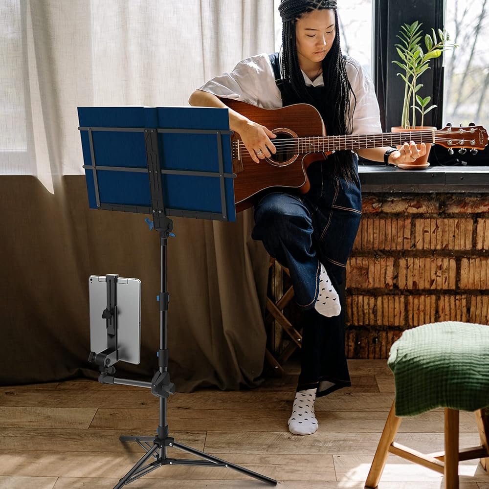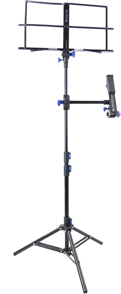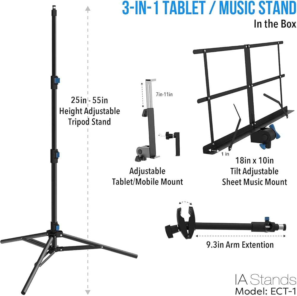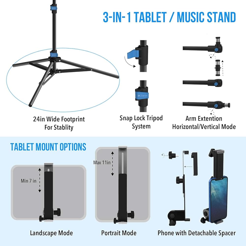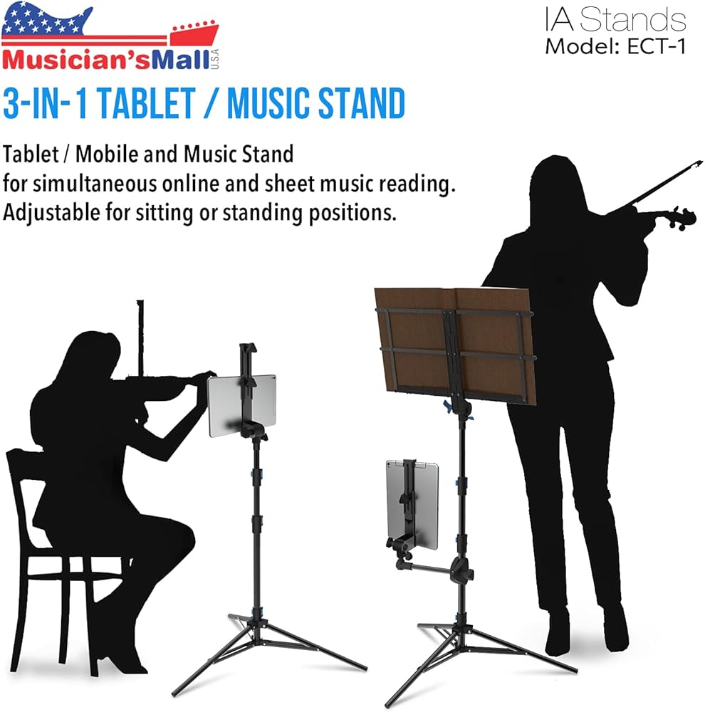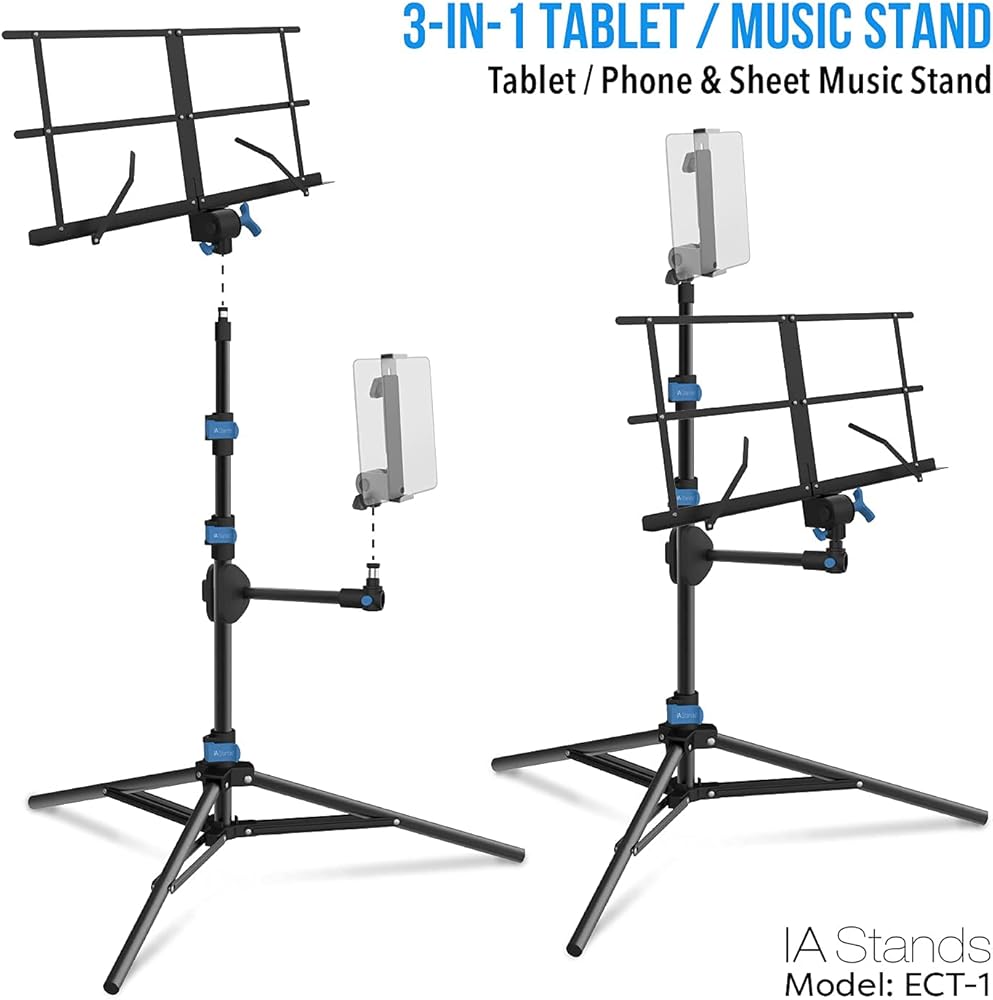 ✔️ Multipurpose capability - This stand has many uses. You can interchange the music attachment and tablet/phone attachment. Either attachment can go on top. Works great as a phone tripod stand and phone holder. This stand can be used while sitting or standing. The sheet music holder can be oriented horizontally to hold a laptop computer or a projector.