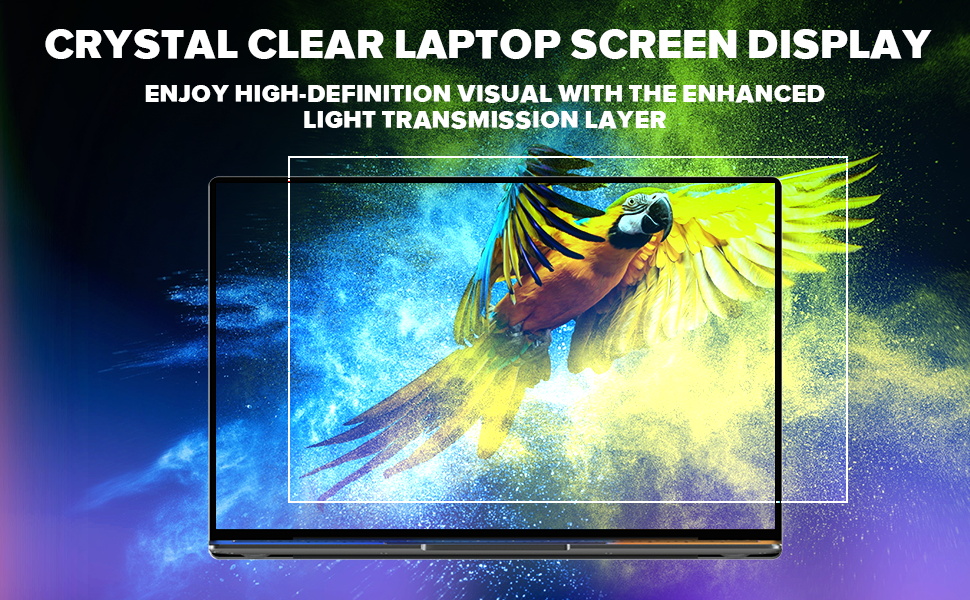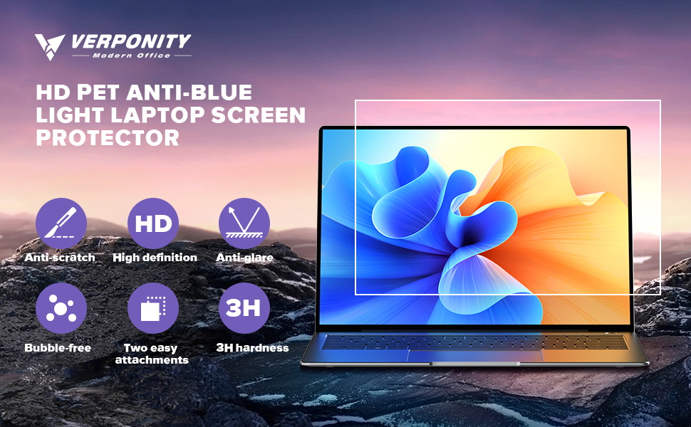 [HD Laptop Screen Protector]: VERPONITY laptop screen protector is designed to preserve the original color and brightness of your screen while relieving you from harmful light and eye strain with long time use of laptop.Put the anti blue light screen protector on, you have no worry about the blurry and poorful visuals from now on. With the upgraded transimisson layer, your display remains crystal clear and enhances the viewing experience by reducing glare and reflections.