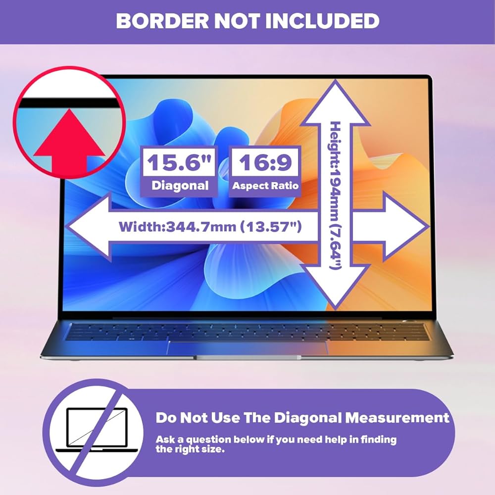 [Considerate After-Sales Service]: Please meauer the width and height of your laptop screen without calculating the boarder. The exact size for 15.6 inch laptop screen protector is 13.57"*7.64" which is ideal for students and office professionals. Any questions about it, please feel free to contact us and we will help you within 24 hours.
