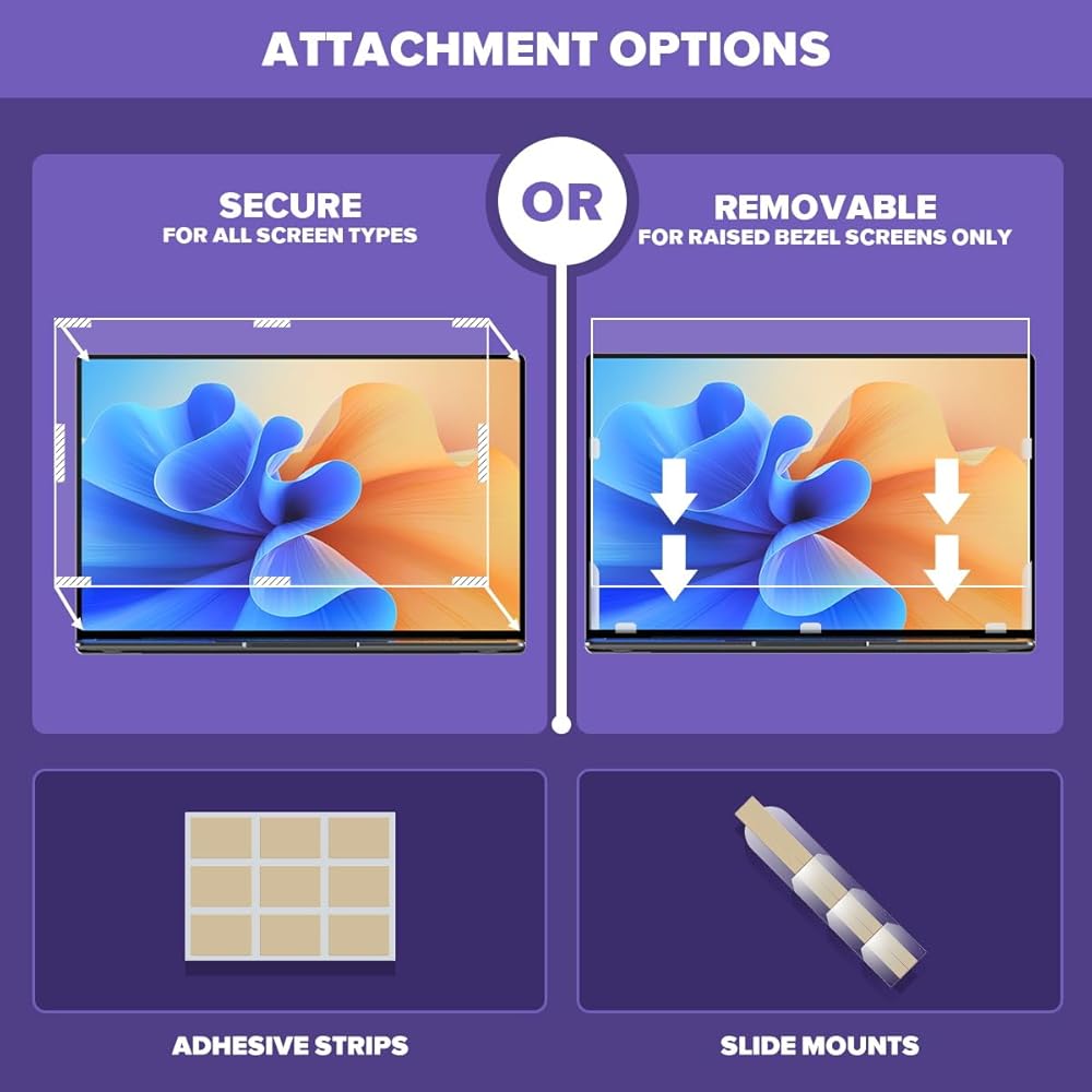 [Zero Bubble Two Simple Installation]: This 15.6 inch laptop screen protector is desiged with two easy attachments for different kinds of computer. Option 1 You may use the clear adhesive strips that securely attach to any computer screen. Option 2 (for computer screens with a raised bezel only) uses slide mount tabs that easily stick to the display frame, allowing you to slide the privacy screen filter on and off as needed. There will be zero bubbles with our premium PET material.