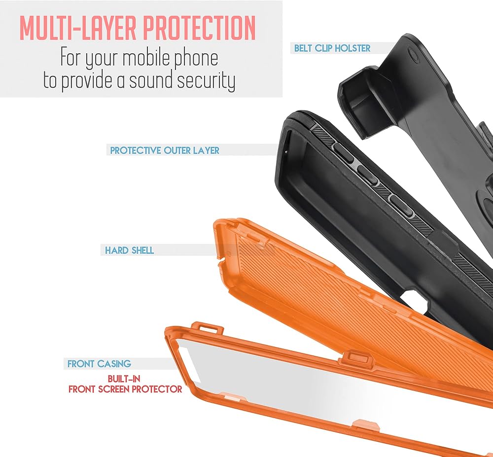 Built-in HANDSFREE KICKSTAND, watch video without holding. Built-in Iron Mounting Plate, compatible with Built-in LOCKING ROTATABLE BELT CLIP, rotate 180 degrees