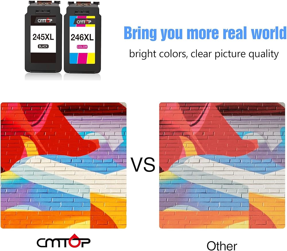 Excellent Quality Chip & Ink: Compatible ink cartridges canon 245 and 246 are recognized by the printer, ink levels are shown, and both text and pictures are superb.