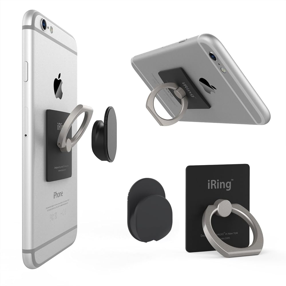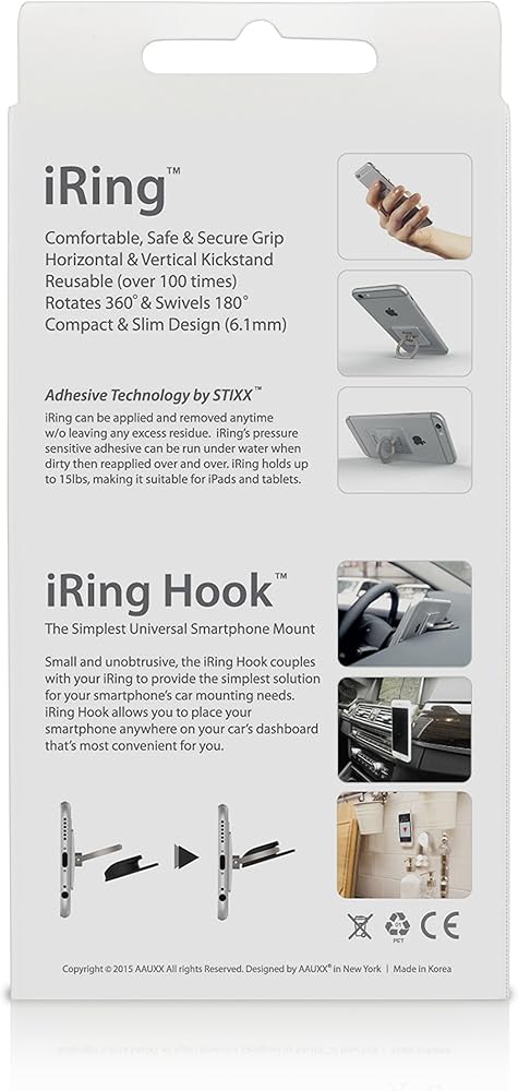 What's included: iRing, iRing Hook. iRing gives you comfortable grip that reduces the chances of drop and device damage, and you can use iRing to prop your device up. The patented hinge structure only by iRing keeps the ring rigid providing solid support to the phone in any position. You can also combine your iRing with other iRing Accessories to maximize its utility. Reusable Adhesive sticks to most devices/cases except Anti-Fingerprint coating or sillicone ones. iRing Hook is exclusively designed to hold an iRing, so put your hook anywhere you want, and hook your iRing.