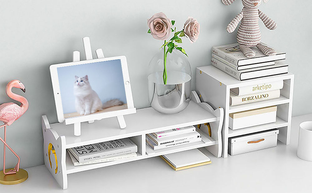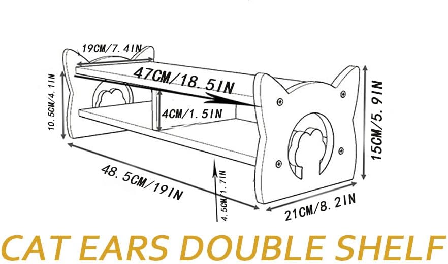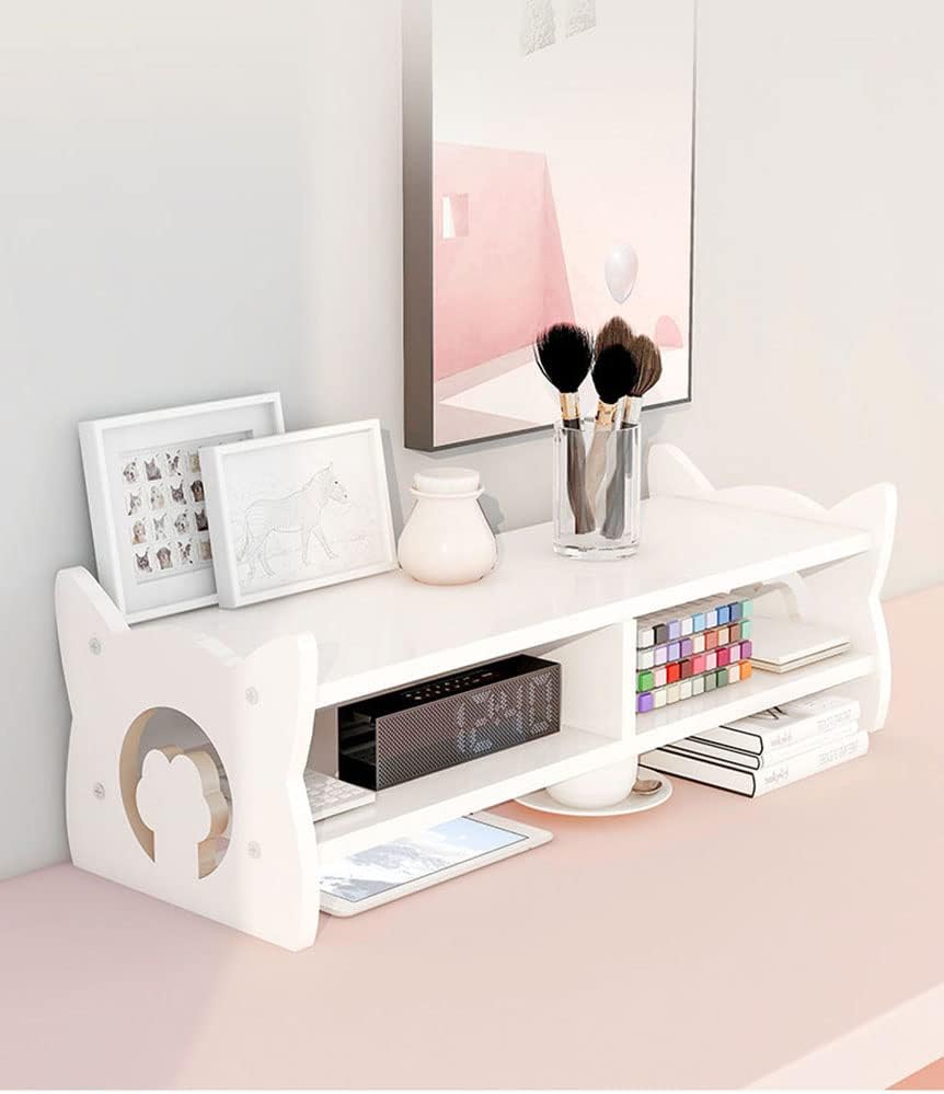 ❤ [Design]:This monitor stand with cat ears is a two-tiered shelf with a cat-inspired design. Two-tier display shelves add height and storage space. It has a compact body and a large storage space. The upper and lower spaces are divided independently, and all fragmentary items are invisible. Dimensions: Outer length 19x8.2Wx5.9H inches, inner length 18.5x7.4Wx4.1H inches.