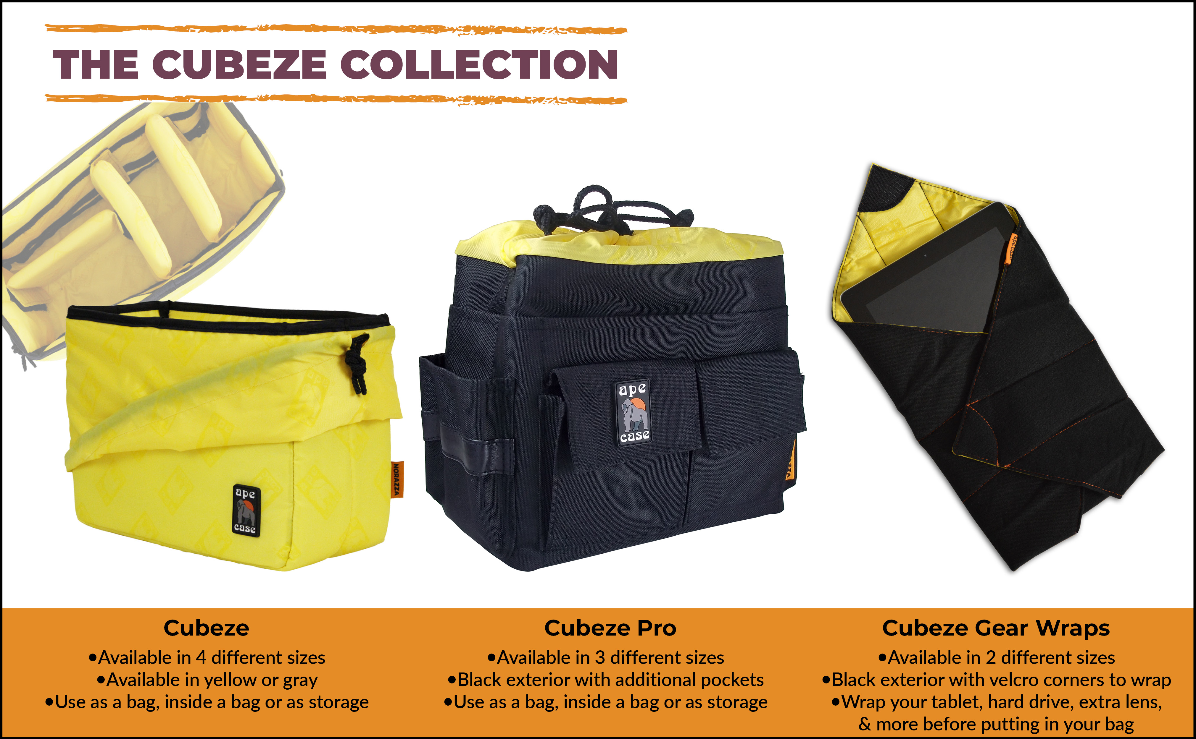 The ACQB33 is the first of our acclaimed Cubeze collection Cubeze are a fully padded reconfigurable camera insert bag that can be used inside another bag as its own bag or as storage Turn any backpack or your favorite bag into a camera bag with the simple addition of a Cubeze Camera Insert Bag Dimensions Exterior Width 3 5" Exterior Length 7 75" Exterior Height 6" Interior Width 3" Interior Length 7 5" Interior Height 6"