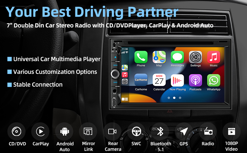 Double Din Car Stereo with CD/DVD Player, 7-Inch Touch Screen, Bluetooth 5.1, CarPlay/Android Auto, Backup Camera, USB/TF Card Slots, FM Radio, AUX Input