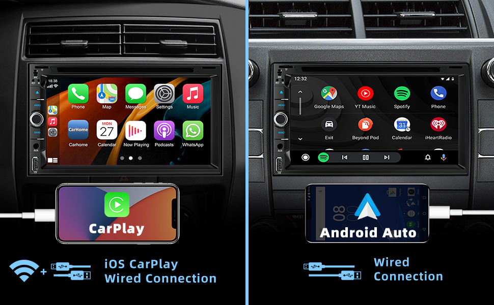 Apple CarPlay&Android Auto -- Access icons on your iPhone by activating Siri/Google Assistant voice controls or touchscreen. Available features include Phone, Music, Maps, Text messages, Radio, Podcasts, Audiobooks. This car stereo make your drive more interesting.