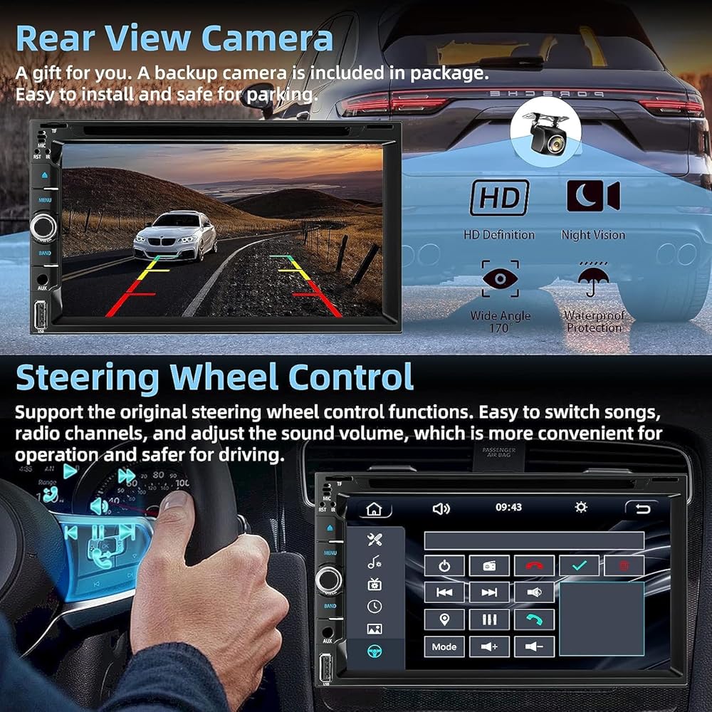 Rear View Backup Camera--The Car radio receiver supports the rear view and will display the image automatically when the vehicle shifts into reverse. HD night vision rear view camera is included, ultra-wide viewing angle of 170 ° and a fully waterproof design, helps to park more safely and easily.