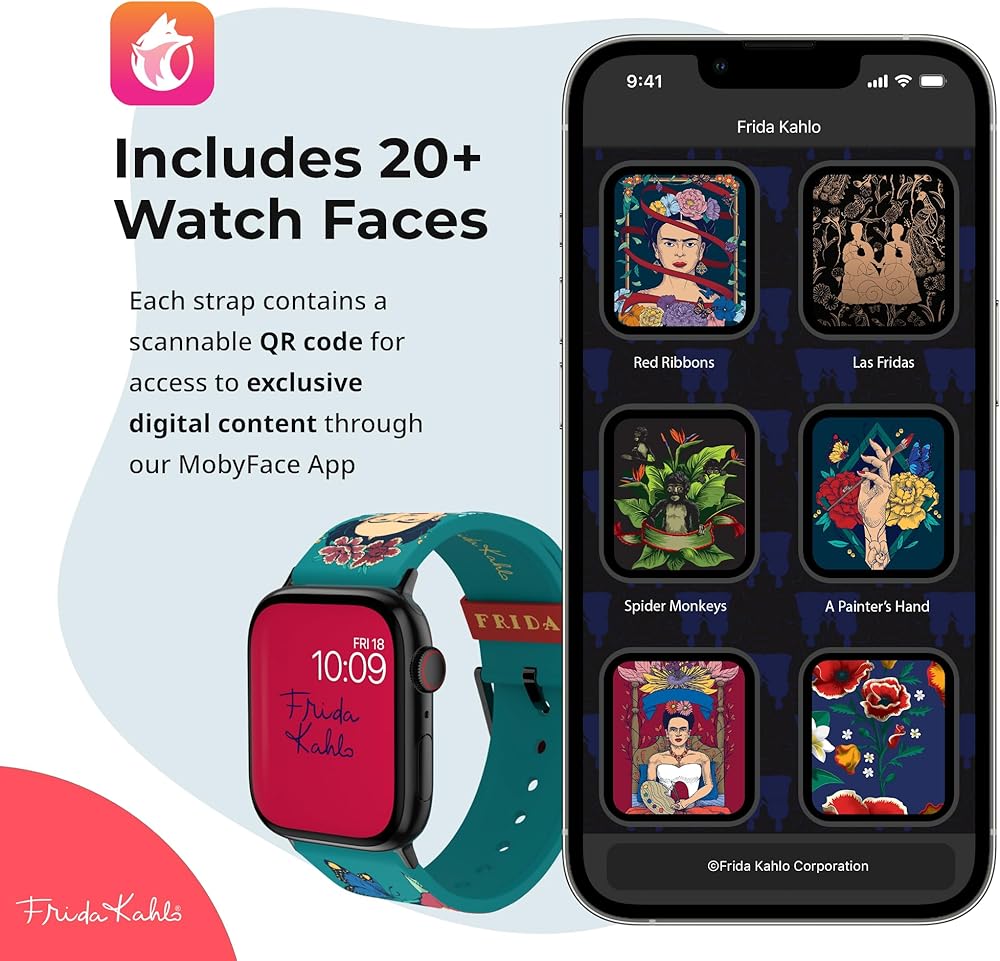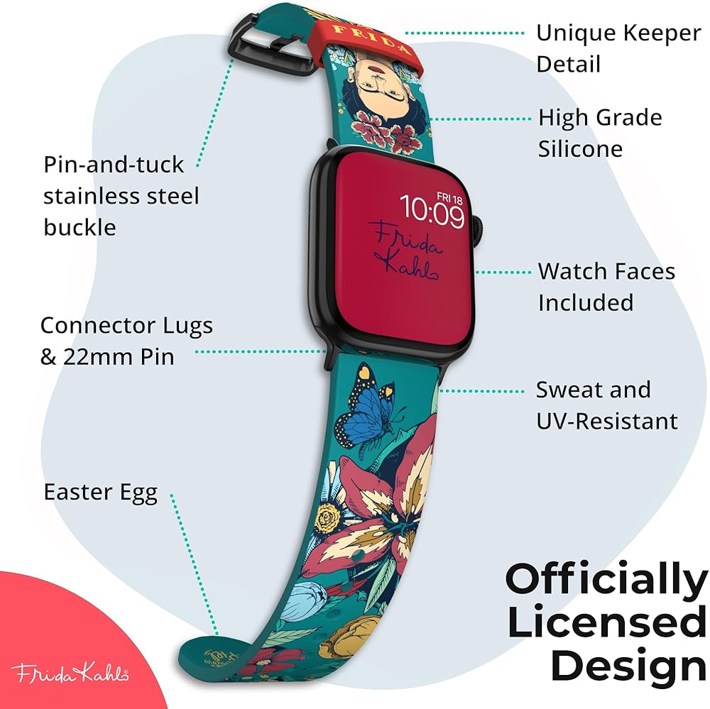 This Frida Kahlo inspired band is a celebration of the artist known for her self-portraits, evoking her use of bold colors, bright florals, and her signature, penetrating gaze. Officially licensed by Frida Kahlo Corporation