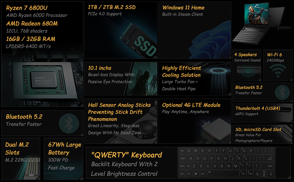 Battery: GPD Win Max 2 is Equipped with 67Wh large-capacity and high-density polymer lithium batteries; Hours Of Heavy Use, 6-8 Hours Of Moderate Use, 14 Hours Of Light Use, Depending On The Specific Environment Of Use