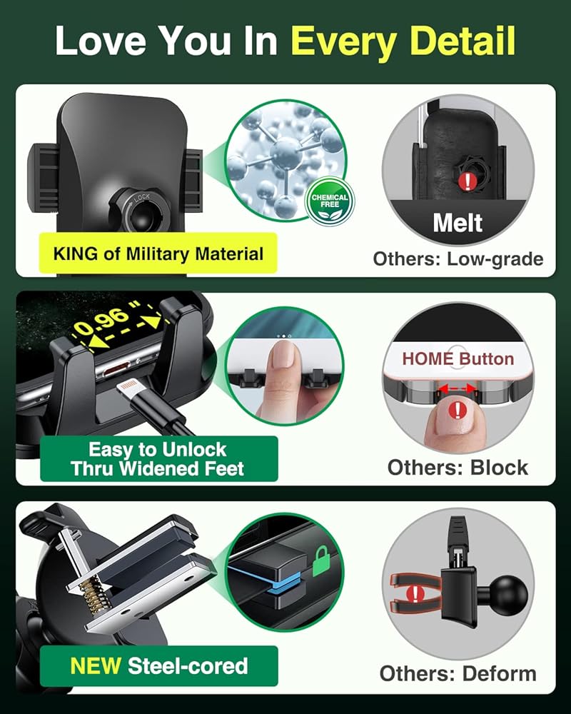 【Materials are the Key to Everything: The Quality & Lifespan of car mount, the Safety of You, Car &Phone】All look similar, but we stands out by Quality & Eco-friendly: Significantly different from cheap plastic with eco-damage, after 8 years of R&D & 8,000 kinds of materials tests, we finally found the BEST materials for Extreme Driving Condition from 20,900 kinds of materials. Rigorously-tested Stability,Compatibility,Security&Durability. Also 0 carbon emission overall to be Climate-Friendly