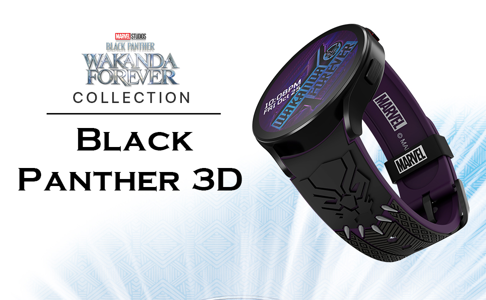 Wakanda Forever! Power up and build bridges with others when you wear this black and purple watch band; the design takes inspiration from the iconic Panther Habit suit, with eye-catching embossed elements and MARVEL text on the free loop