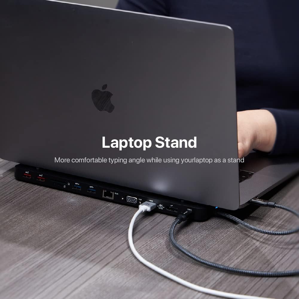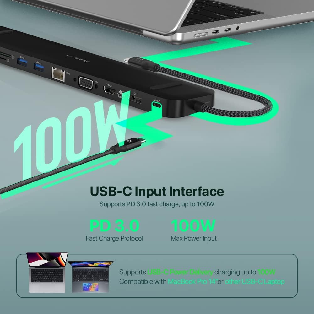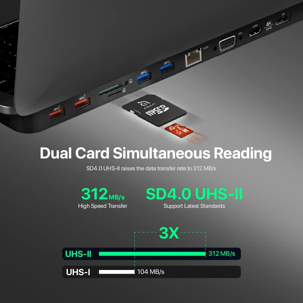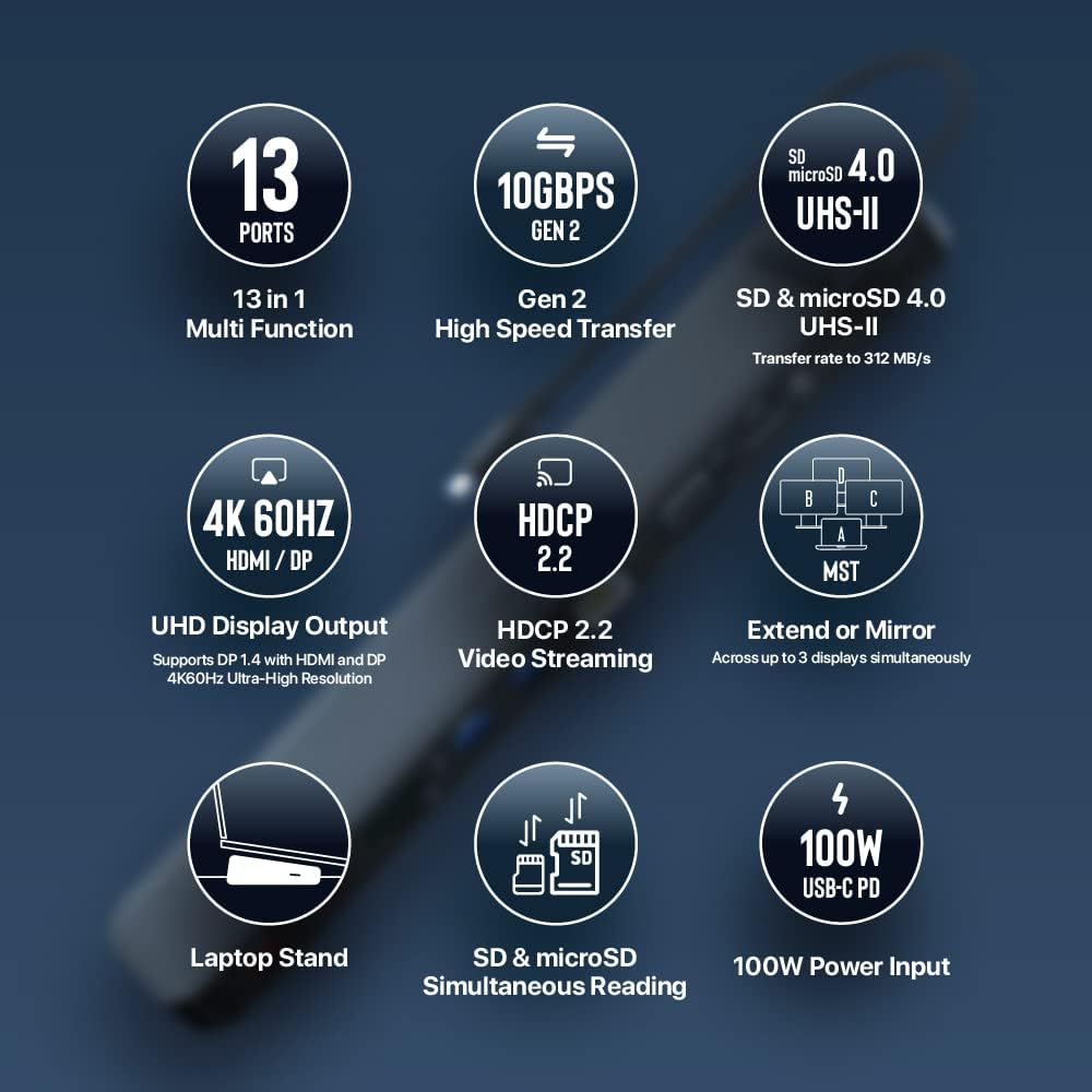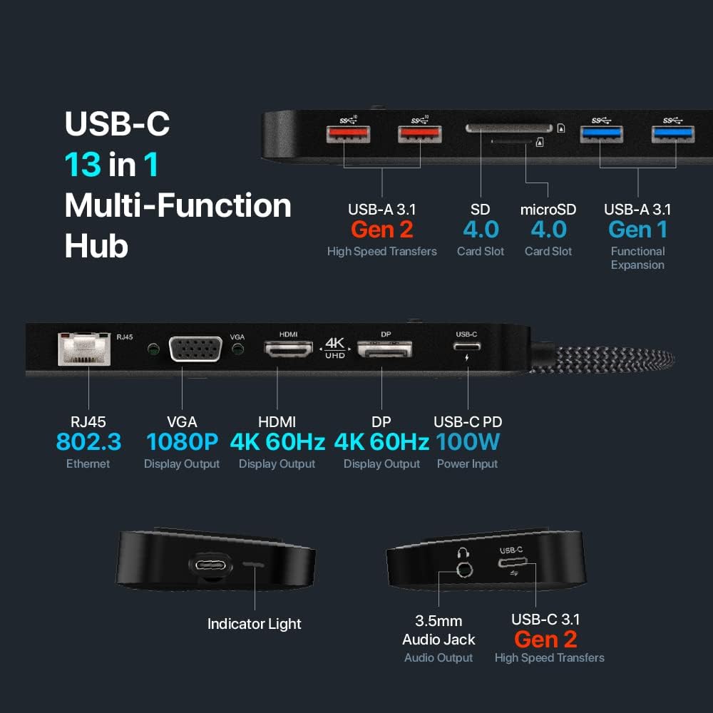 4K60Hz USB-C 13IN1 MULTIPORT DOCK STATION– With USB Type-C PD x 1 [Power Delivery Pass-Through charging up to 100W], USB-A 3.1 Gen 2 x 2 (Up to 10Gbps), USB-C 3.1 Gen 2 x 1 (Up to 10Gbps), USB-A 3.1 Gen 1 x 2 (Up to 5Gbps), HDMI x 1 (DP 1.4, up to 4K @ 60Hz), DP x 1 (DP 1.4, up to 4K @ 60Hz), VGA x 1 (Up to 1080P @ 60Hz), RJ45 x 1, SD card slot x 1 [SD / SDHC / SDXC, SD4.0, up to 312MB/s], microSD card slot x 1 [microSD / microSDHC / microSDXC, SD4.0, up to 312MB/s], Audio x 1 [3.5 mm audio jack].