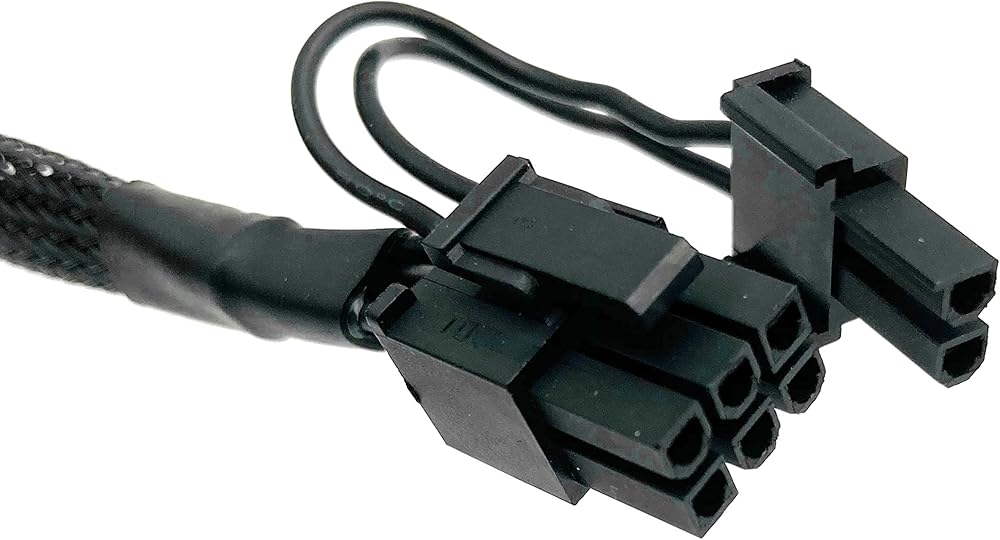 Note: ATX 8-pin male connector connected to the power supply and two PCIe 8-pin (6+2) male connectors plugged into the video graphics card.