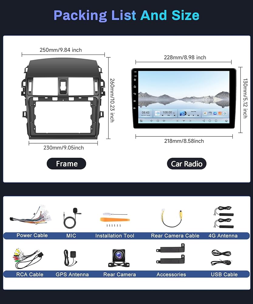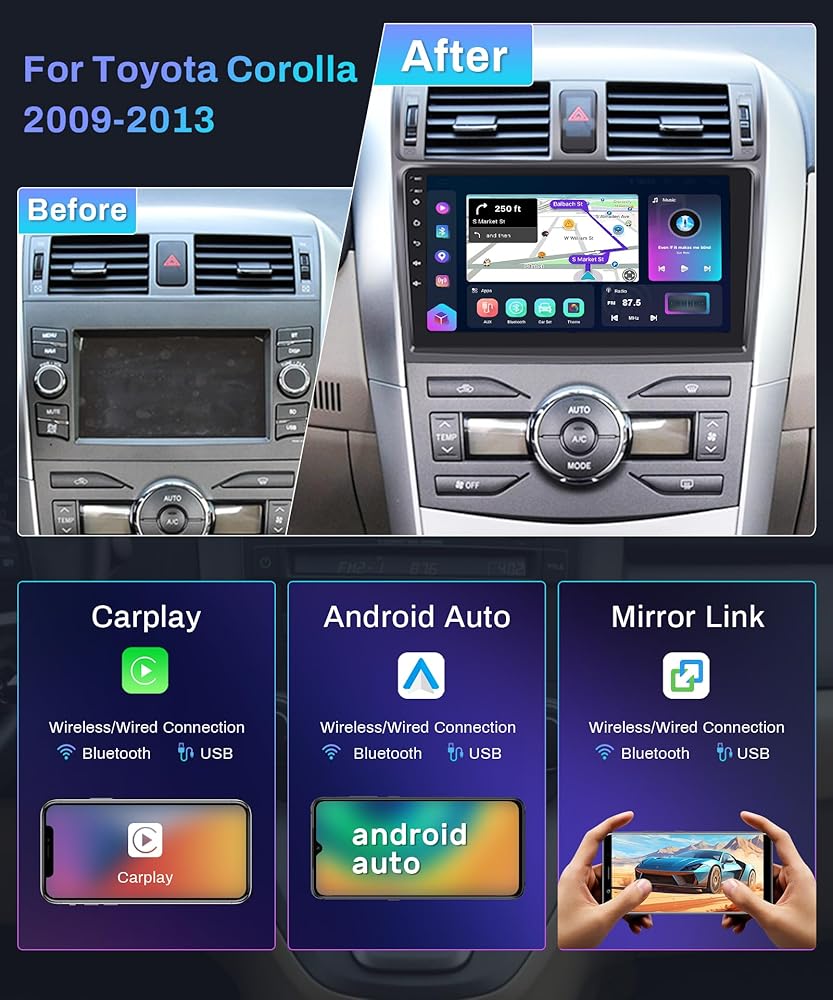 🚗【Stereo Configuration & Car Compatibility】Perfectly compatible with Toyota Corolla 2009 2010 2011 2012 2013 without additional accessories.Features Android 11.0, 9 inch 2.5D 1080P HD vertical touch screen, 2G RAM+64G ROM, offline/online GPS navigation, Wi-Fi, RDS/FM radio, two USB, 7 EQ settings, built-in Hi-Fi, waterproof HD rear view camera, and steering wheel control of original car.