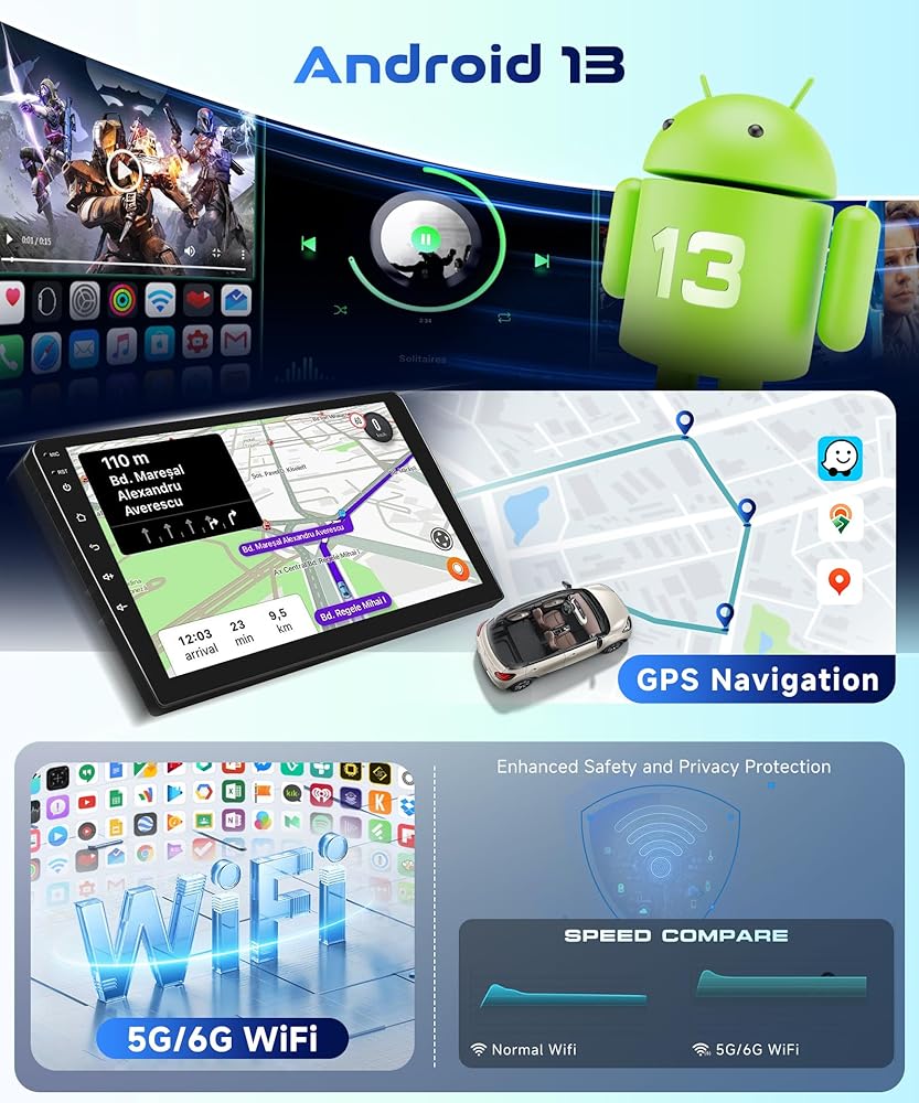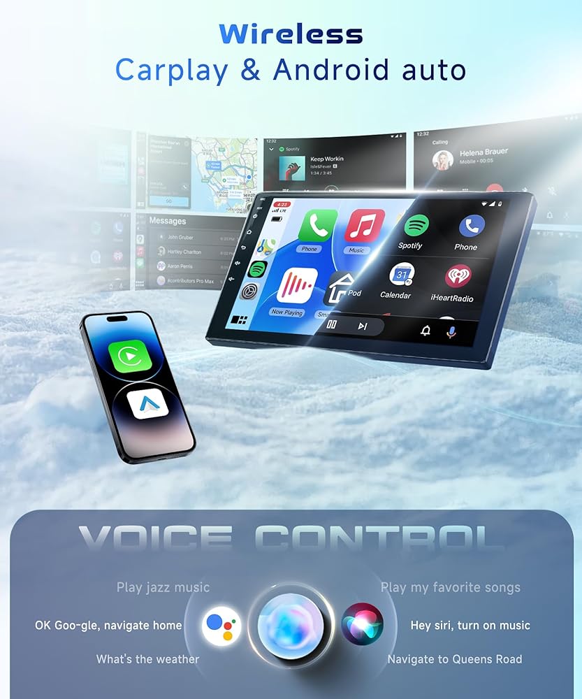 🚗【Wireless Apple Carplay & Android Auto Stereo】This car stereo supports both wired and wireless Apple Carplay and Android Auto (excluding Huawei and Samsung phones). Connect via Bluetooth or USB to access phone functions like music, GPS, calls, and messages on the large touch screen for added convenience.
