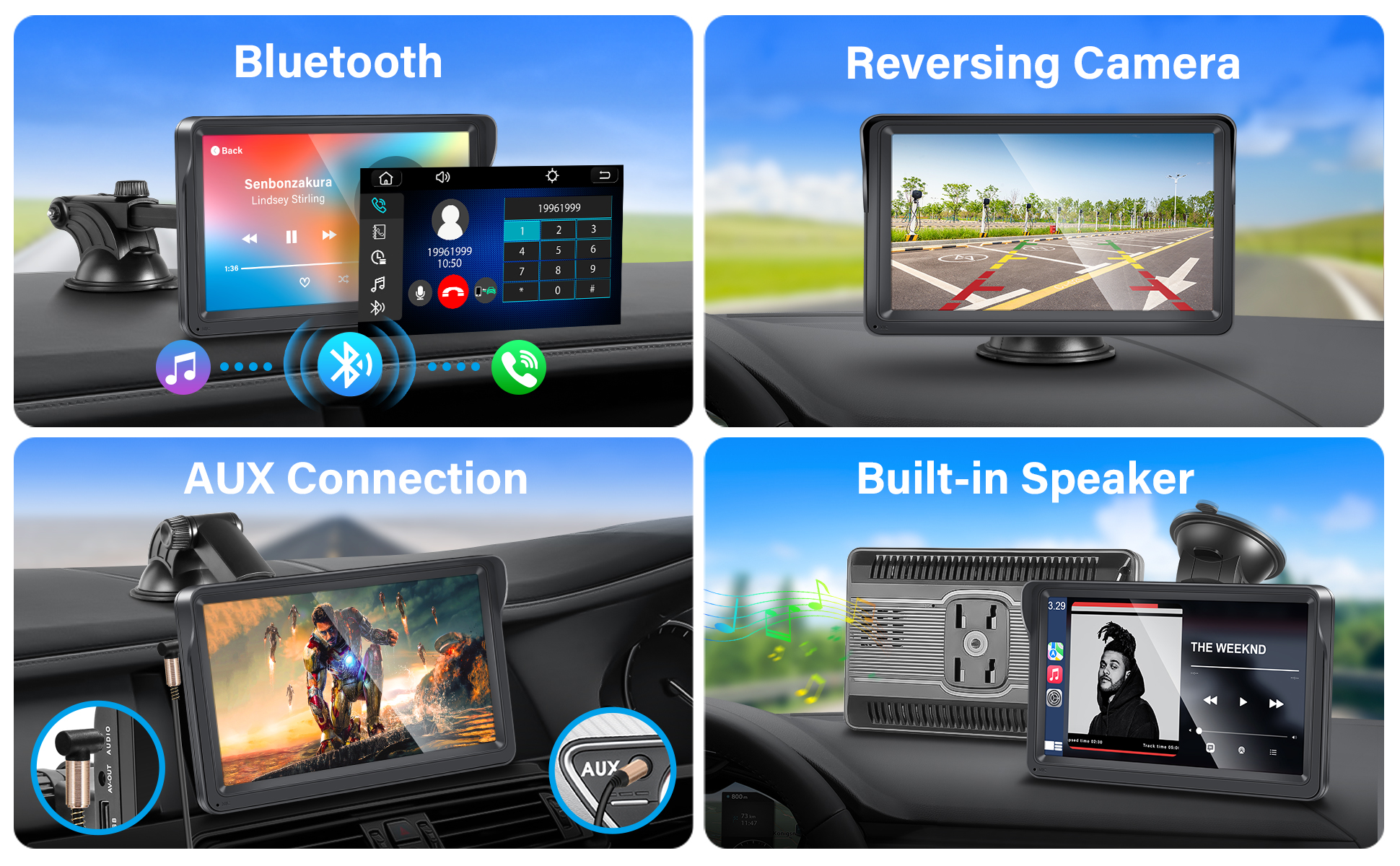 【Bluetooth/FM/AUX】The portable car play can take calls using Bluetooth and is equipped with an external microphone to provide you with a better calling environment. It can also be used to play music etc. using Bluetooth. Turn on the FM interface of the portable apple car play and tune the portable radio and the car's own radio to the same channel to transmit the audio. You can also use an AUX cable to link the portable car stereo to the car's own radio to transmit audio.