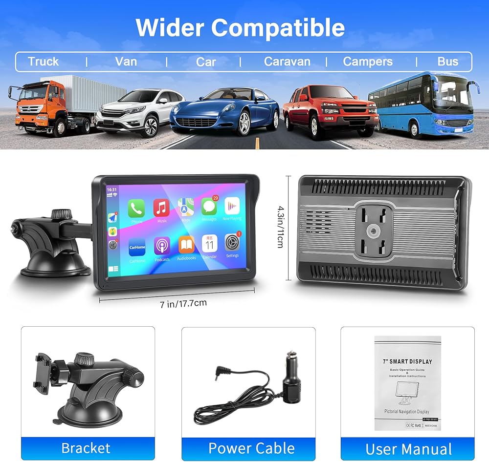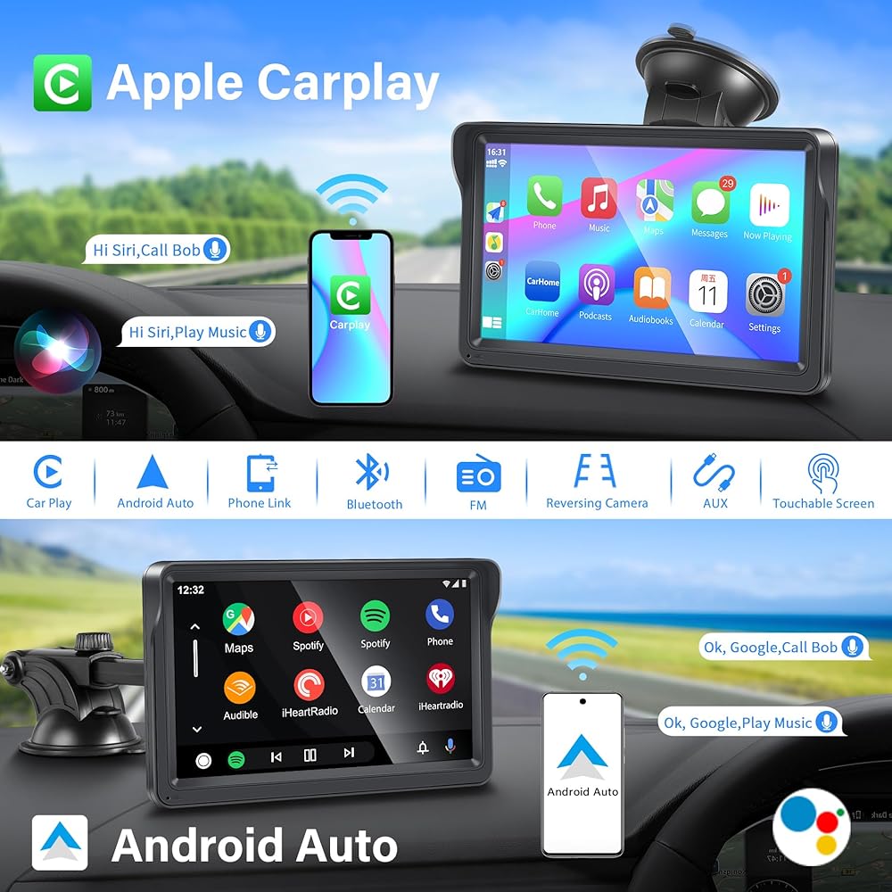 Wireless Apple Carplay Portable Car Stereo and Android Auto,Carplay Screen for Car Radio with Bluetooth Hands-Free,7 Inch Touch Screen with Mirror Link/Voice Control/FM/TF Card/USB/AUX