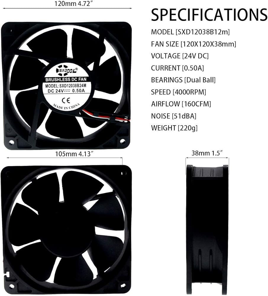 SXDOOL 120mm 24v Fan 0.50A 160CFM,High Speed 120mm x 120mm x 38mm Ball Bearing Cooling Cooler