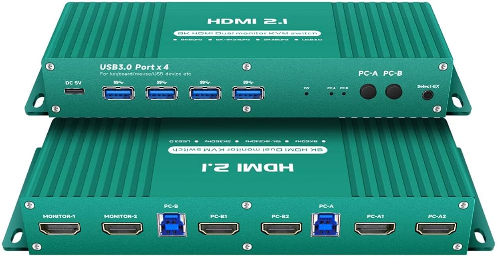 【Dual monitor kvm switch displayport hdmi】HDMI2.1 + DP2.0KVM Switch , RGB 4:4:4 HDR10+, HDMI 2.0 and DP1.4 compatible. Supported resolutions:8K@60Hz, 4K@144Hz, 4K@240Hz , 2560x1440@144Hz 165Hz and 5120*1440@120Hz 1440P 60Hz 75Hz 100Hz 120Hz 144Hz 165hz 175hz 240hz. Final resolution is also subject to graphic cards, monitors, cables and adapters and there work together;