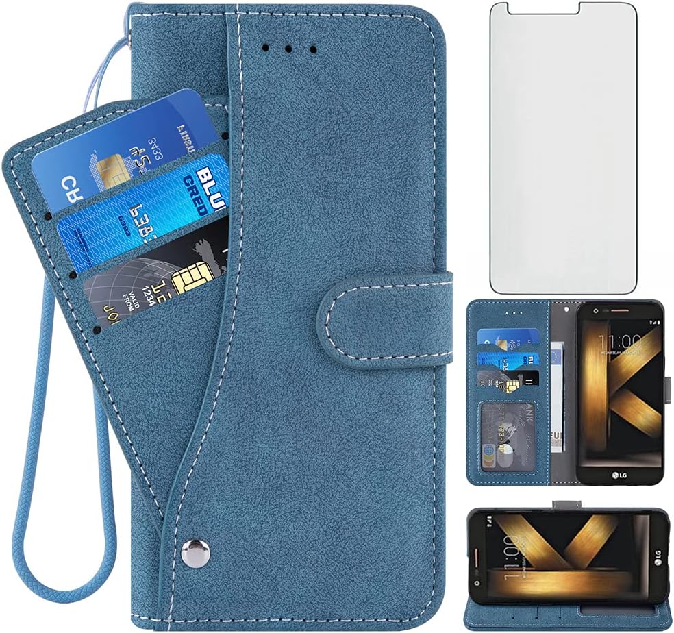 Compatible with LG K20/K20 Plus/K20 V/Harmony/V5/K10 2017/Grace LTE Wallet Case and Tempered Glass Screen Protector Flip Credit Card Holder Stand Cell Phone Cover for LGK20V K20V K 20 20K K20+ Blue