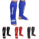 The Combat Sports Washable Slip-On Shin Instep Guards combine comprehensive protection with convenient practicality. Made of a comfortable polyester blend material, they easily slip on your legs while remaining secure during heavy action. When the workout is over, the guards can be machine washed to eliminate dirt, sweat and odor by simply sliding out the foam padding.