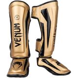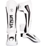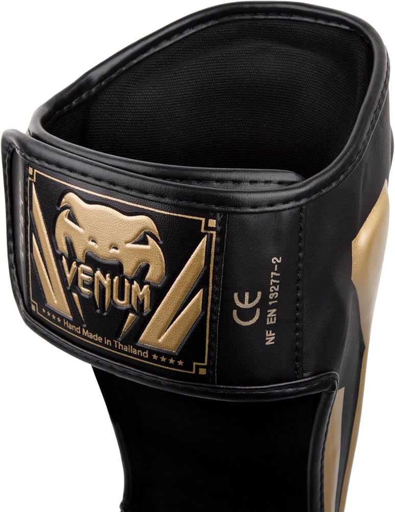 Our Venum Elite shin guards are skillfully handmade in Thailand to provide our elite fighters with the best fighting equipment. Made with 100% Skintex leather, our elite standup shin guards' combines comfort and great durability at an affordable price. Providing pro-anatomical reinforcement on the important key areas – shinbone and instep – delivers ultimate protection and optimal striking surface. The 2 large Velcro straps and the elastic bands placed under the foot and heel ensure you a secure custom fit.