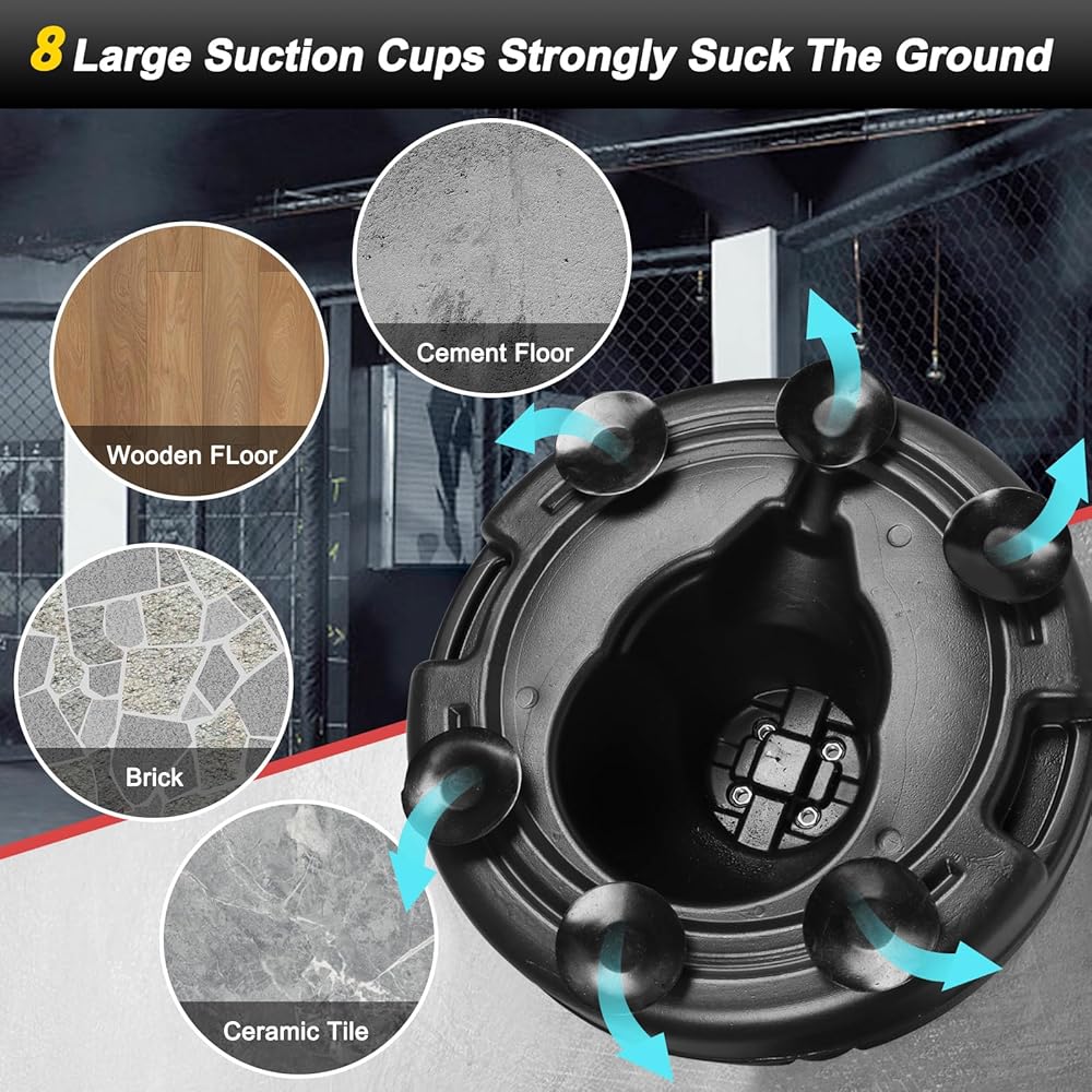 Sturdy Base: The boxing target features a stable base that can be filled with water or sand to maintain stability. The bottom is equipped with 6 suction cups to prevent floor scratches and ensure stability during workouts. It works perfectly on any smooth surface, whether it's tiles, wooden floors, or concrete floors