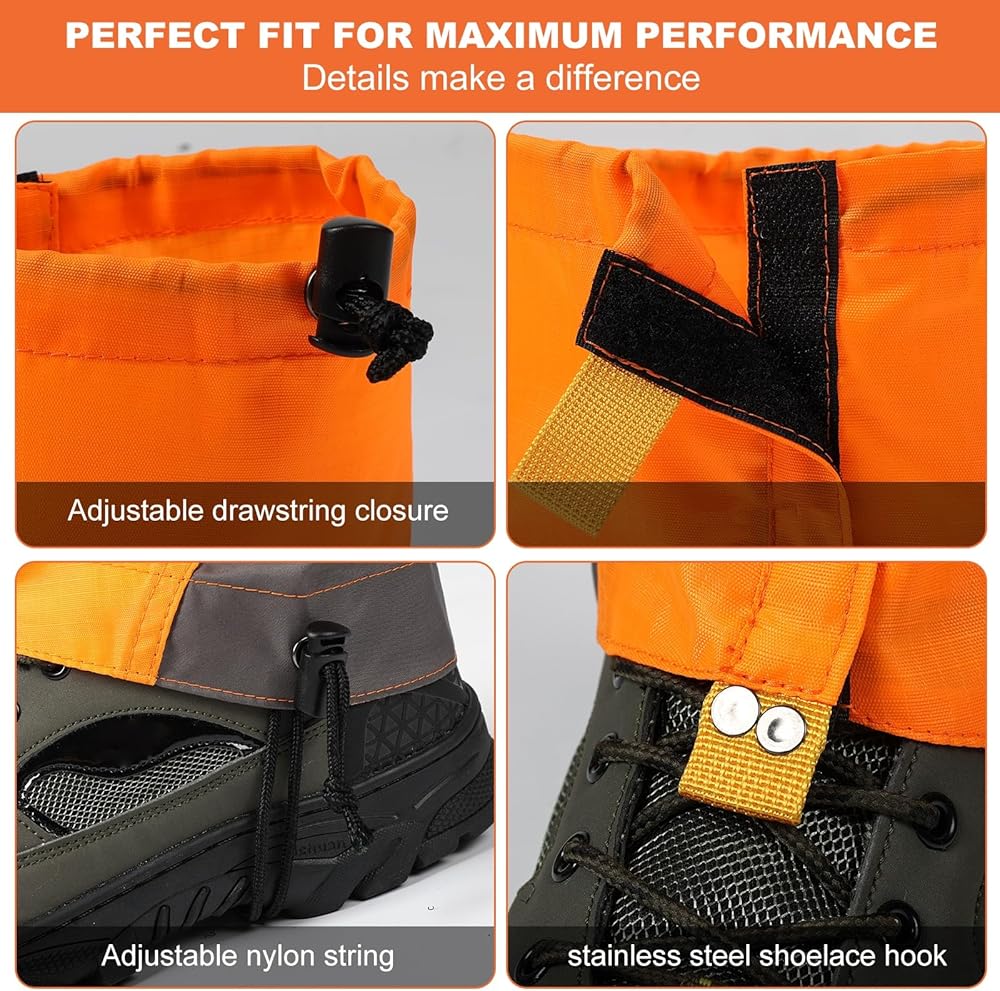 ✔ One Size Fit All - The gaiters are adjustable to fit most men and women, the top closure drawstring, 1.18'' wide front velcro, middle elastic bands, stainless steel lace hooks and TPU shoes bands will keep the gaiters in place after long time wearing.