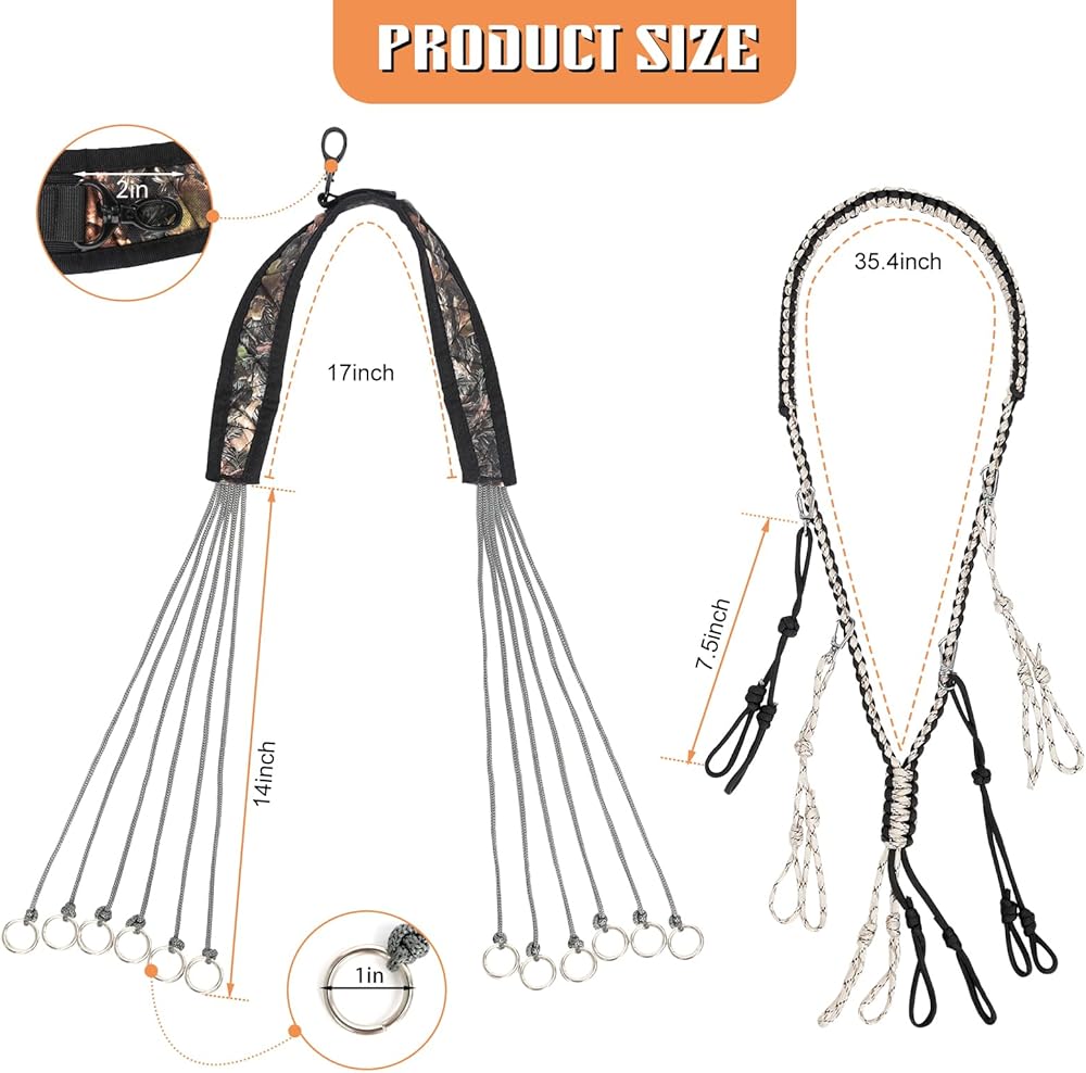 Functional Design: Each waterfowl hunting gear equipped 12 metal hoops( 6 per side),enough to holds 12 ducks, rabbits,geese or whatever you can fit in the drop.And the duck call lanyard features 12 adjustable loops(Includes 4 removable clips),adjustable loops fit all sized calls and you can remove any loops according to your needs.