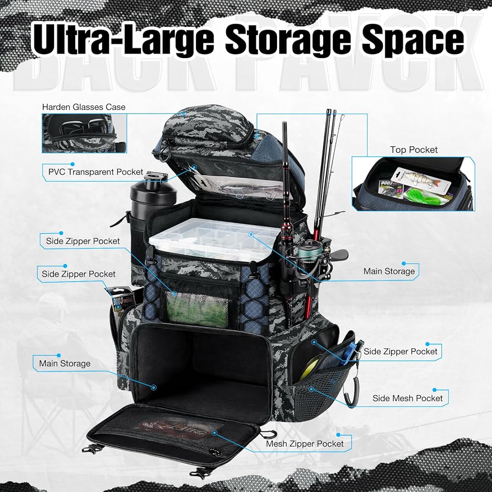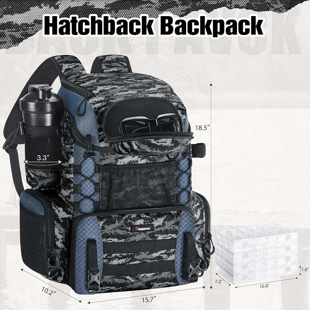 Multifunctional: Our Hatchback backpack is equipped with a rod belt, side pocket, bottle holder, and front patch pocket, making it easy to safely store your fishing rods, water bottle, keys, clothes, fishing pliers, fish lip gripper, and more