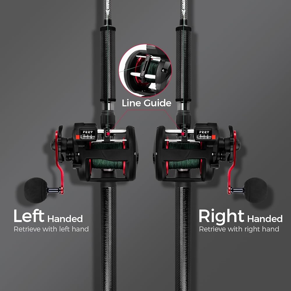 AMAZING DRAG POWER & FEATURES – The ReKon Line Counter round casting reels use a smooth, carbon disc drag that delivers 30 lbs of fish stopping power (25lb for size 10). Both size reels have a line clicker function that makes releasing planer boards simple and easy. You can use that feature as a strike detection system while trolling. Gear ratio is 5.1:1 on the size 10, 5.3:1 on the size 20 and 4.5:1 on the size 30.