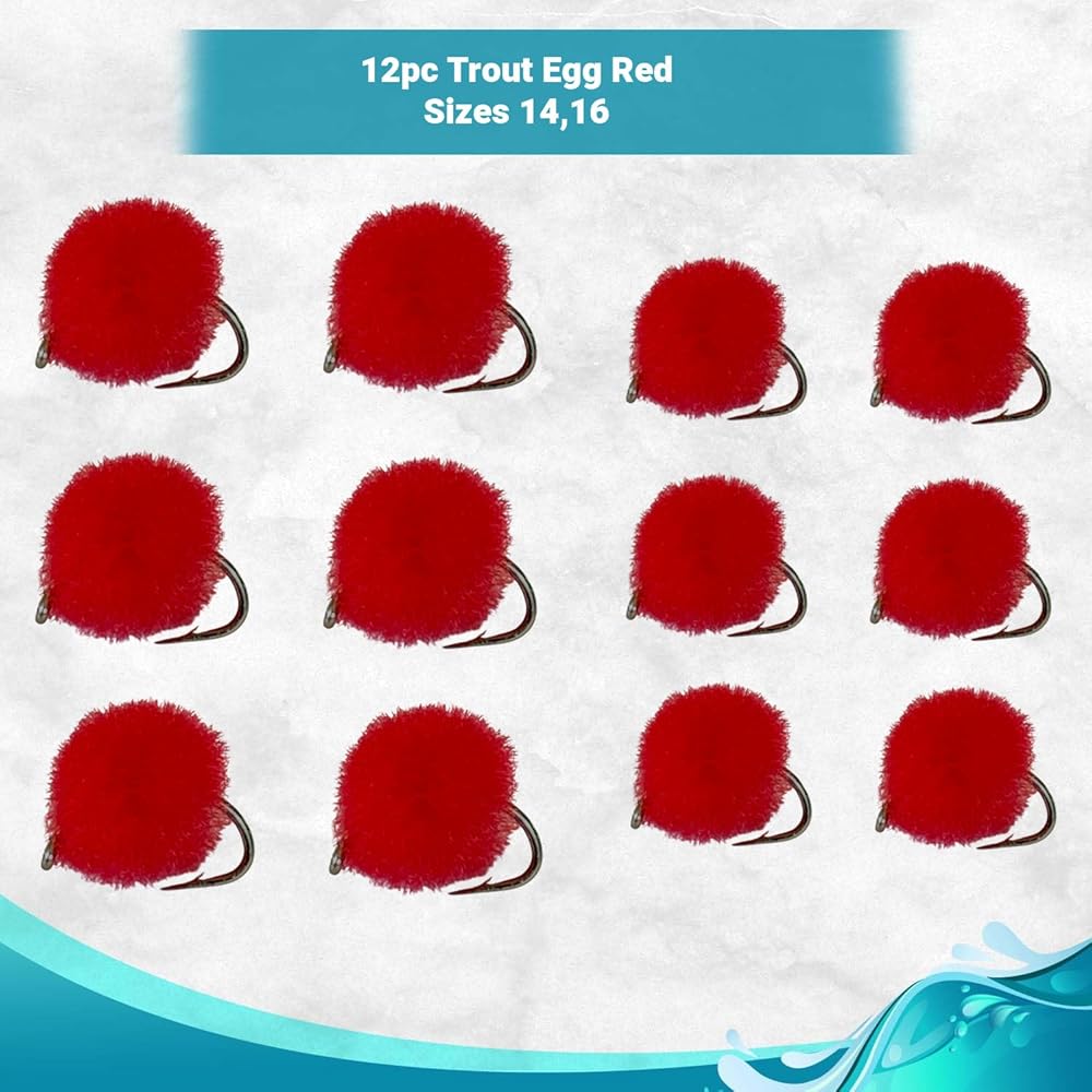 DIFFERENT COLORS AVAILABLE: The trout/salmon eggs are available in different colors - orange, pink, yellow and red. These bright colors will attract big trouts, bass, panfish and more. Select the color of your egg fly above and you will get 6 of them in size 14 and 6 of them in size 16.