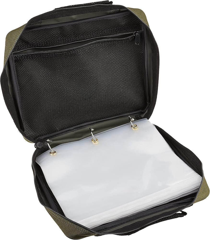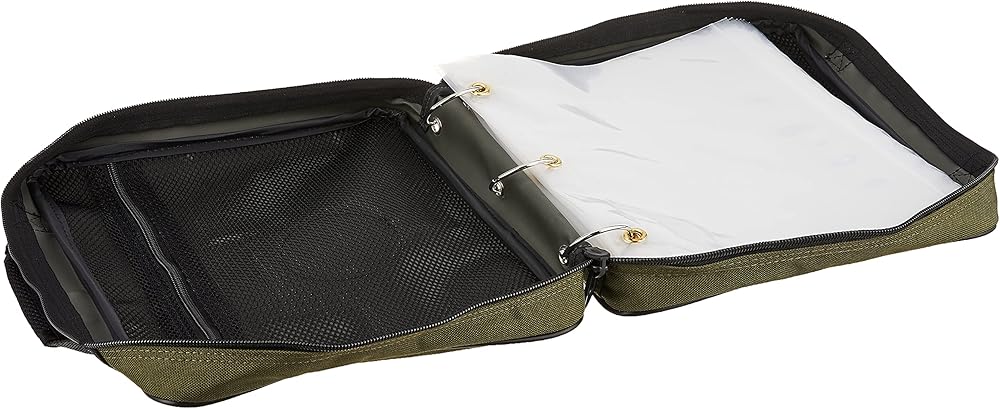 DIMENSIONS: 12 x 10 inches x 2.1/2 inches wide, Olive Green Color, the perfect portable tackle binder to keep your gear dry, organized and ready for your next adventure
