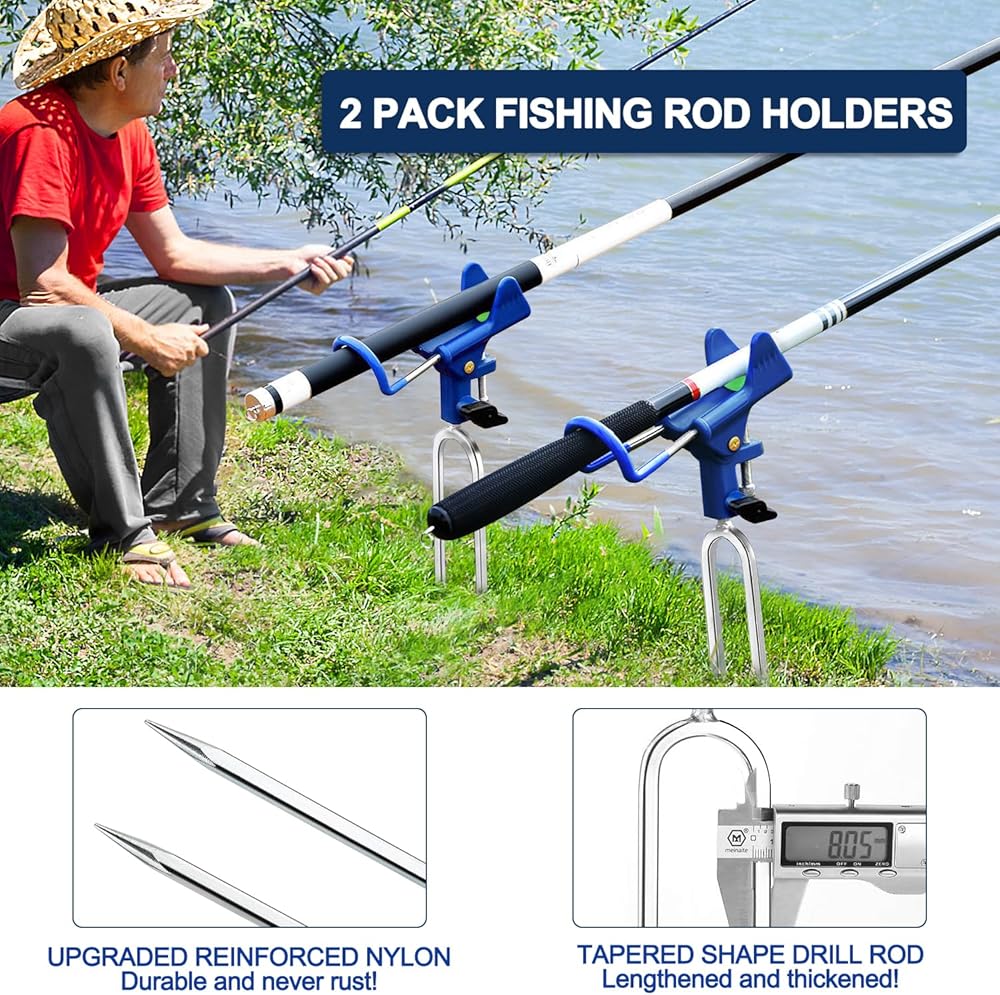 🎣【REAL UPGRADED MATERIAL】The bank fishing rod holder is made of reinforced nylon, which has high hardness and high toughness. And the tapered shape drill rod is added with rust-proof chrome coating for rust prevention, durable and never rusts! Plus lengthened and thickened, which can easily go into the ground(mud, sand, rock cracks).