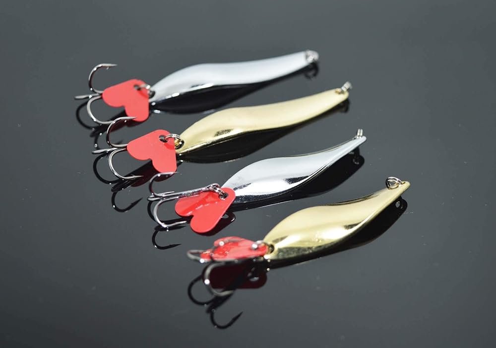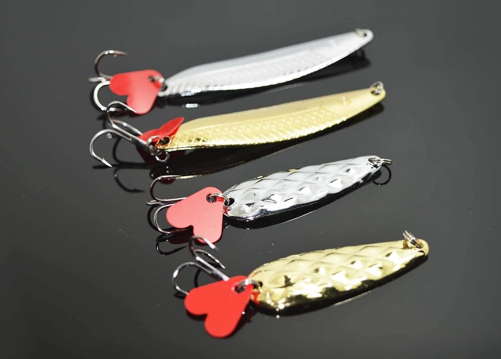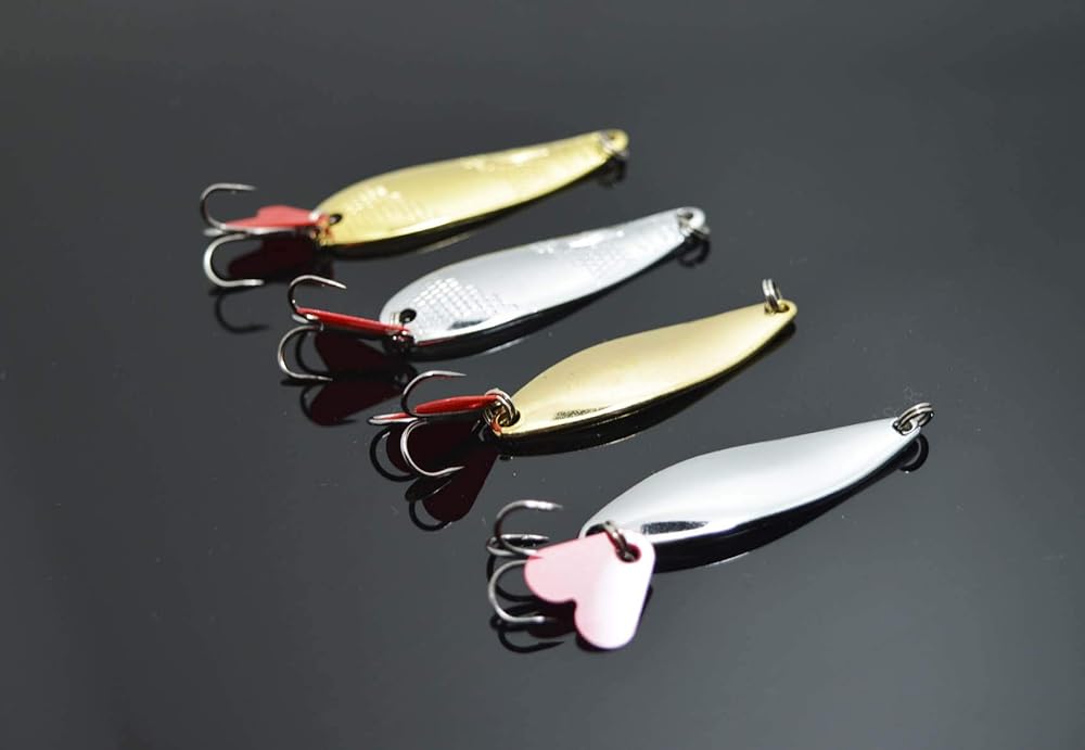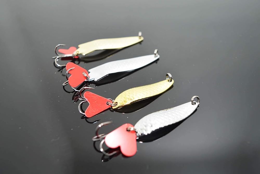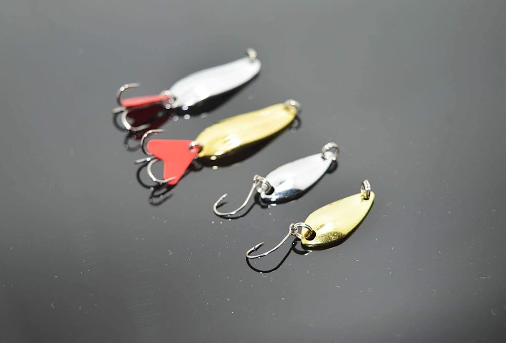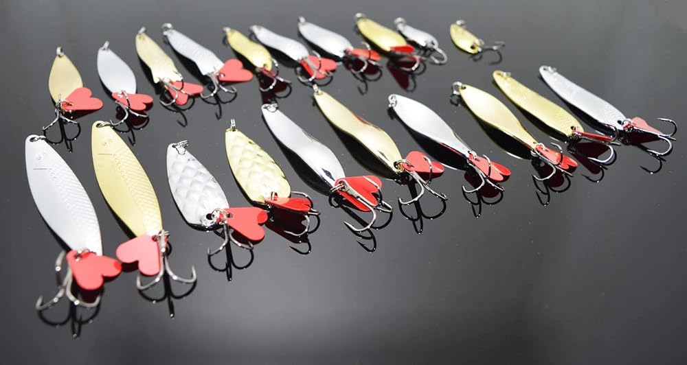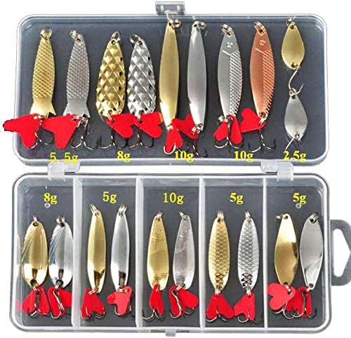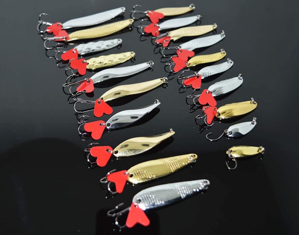 This is a set of 20pcs of fishing lure of spoon lure metal pieces. These are made of zinc alloy, making them bright and shining and good for various shipping purposes. The weight of metal spoon lures range from 2.5g to 10g, and different colors and marks, and each of them carries with its own hook. These fishes are packed in one clear plastic box and easy to carry with.